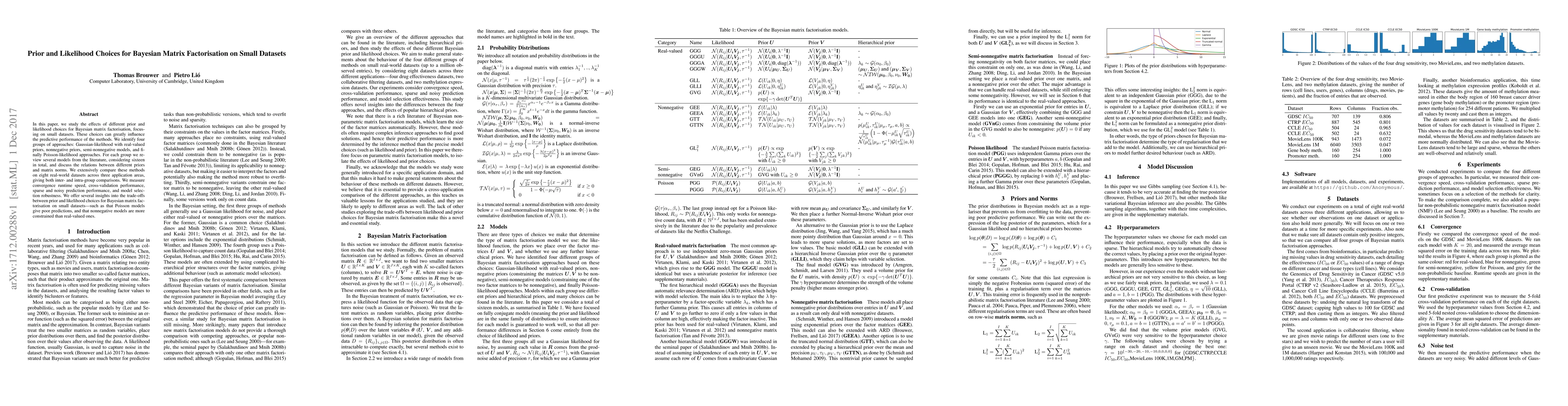 This paper examines the impact of different prior and likelihood choices on Bayesian matrix factorisation for small datasets, comparing sixteen models across four groups. The study reveals insights into the trade-offs, including that Poisson models yield poor predictions and nonnegative priors are more restrictive than real-valued ones.