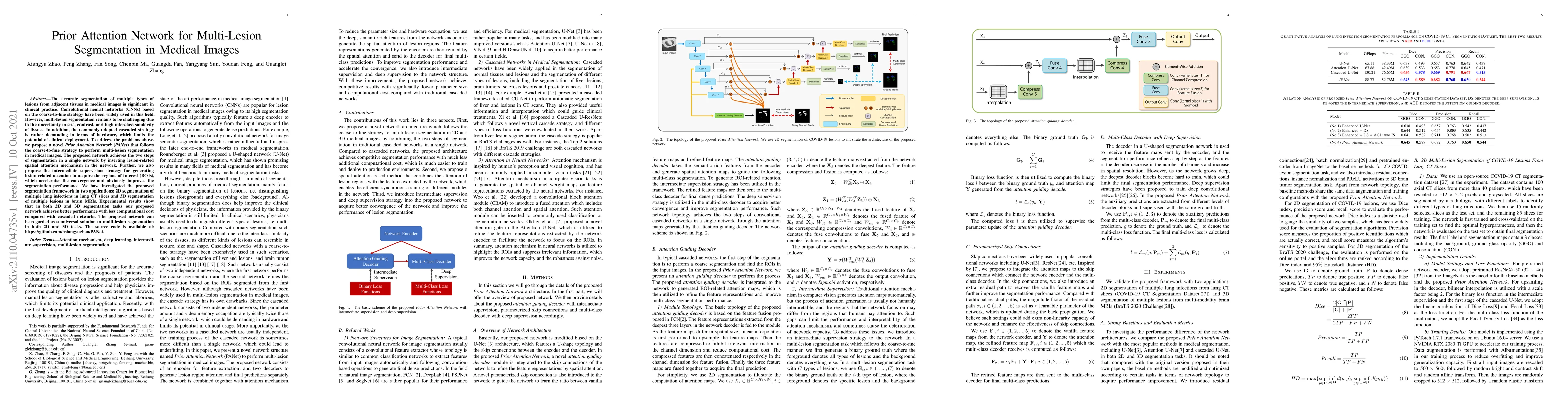The paper proposes a Prior Attention Network (PANet) for multi-lesion segmentation in medical images, integrating a spatial attention mechanism to address challenges in size, contrast, and tissue similarity. The network achieves better performance with lower computational costs compared to cascaded networks, demonstrated through 2D lung infection and 3D brain lesion segmentation tasks.
