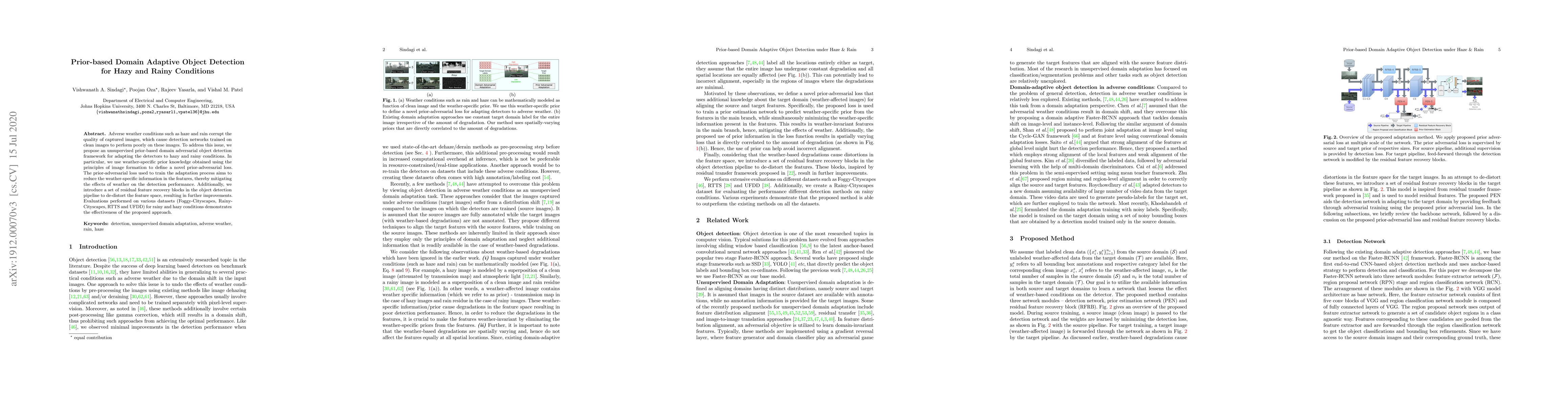 Adverse weather conditions such as haze and rain corrupt the quality of captured images, which cause detection networks trained on clean images to perform poorly on these images. To address this issue, we propose an unsupervised prior-based domain adversarial object detection framework for adapting the detectors to hazy and rainy conditions. In particular, we use weather-specific prior knowledge obtained using the principles of image formation to define a novel prior-adversarial loss. The prior-adversarial loss used to train the adaptation process aims to reduce the weather-specific information in the features, thereby mitigating the effects of weather on the detection performance. Additionally, we introduce a set of residual feature recovery blocks in the object detection pipeline to de-distort the feature space, resulting in further improvements. Evaluations performed on various datasets (Foggy-Cityscapes, Rainy-Cityscapes, RTTS and UFDD) for rainy and hazy conditions demonstrates the effectiveness of the proposed approach.