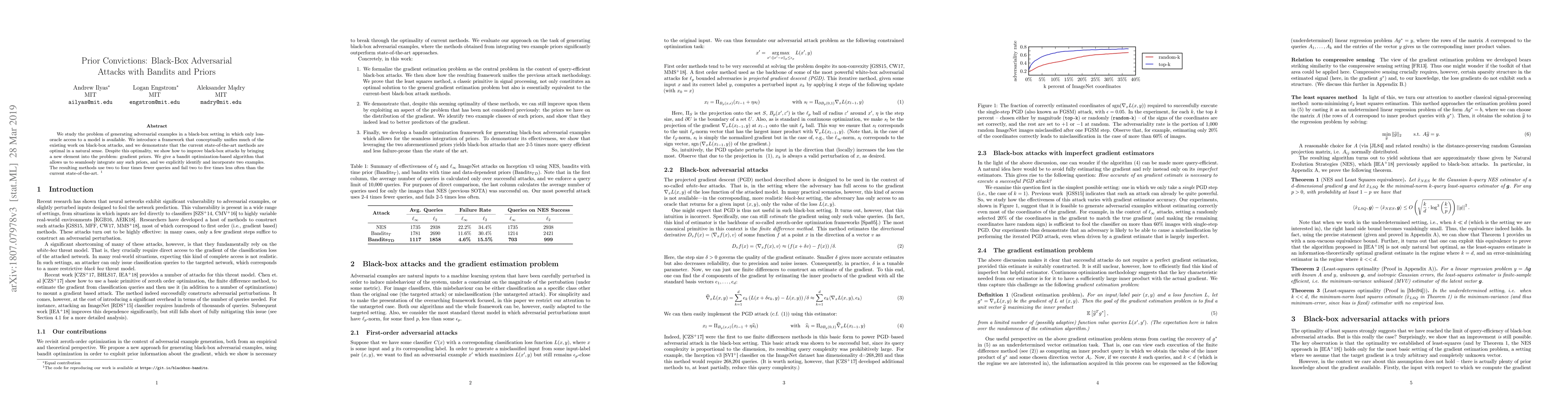 This paper introduces a framework for black-box adversarial attacks that unifies existing methods and demonstrates their optimality. The authors improve these attacks by incorporating gradient priors through a bandit optimization algorithm, resulting in two to four times fewer queries and significantly lower failure rates compared to current state-of-the-art techniques.