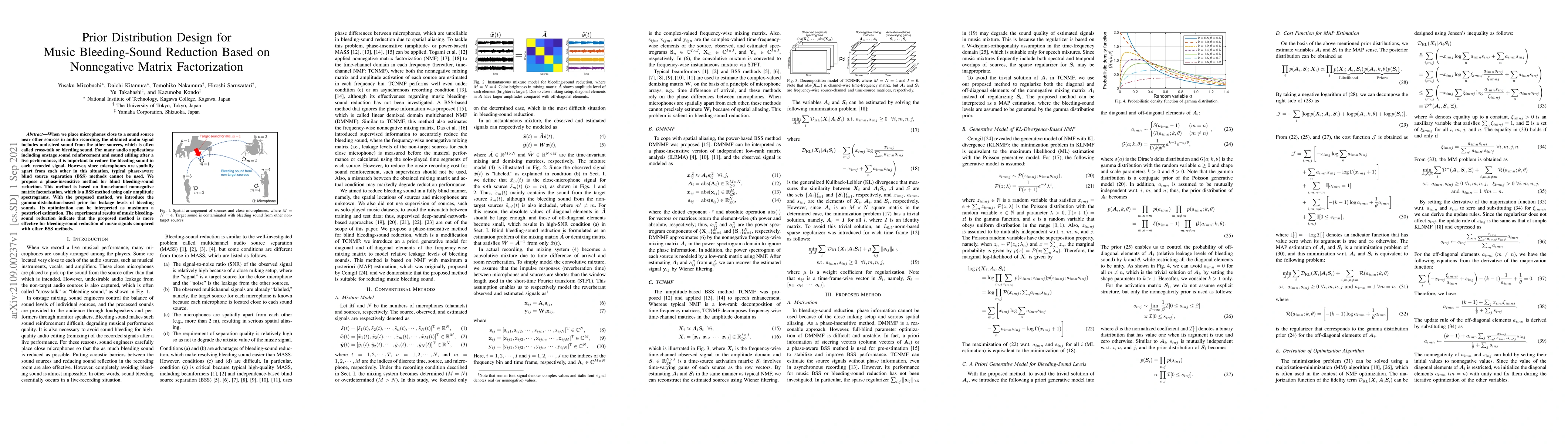 A new method for reducing bleeding sound in audio recordings using nonnegative matrix factorization with a gamma-distribution-based prior is proposed and shown to be more effective than other blind source separation methods.