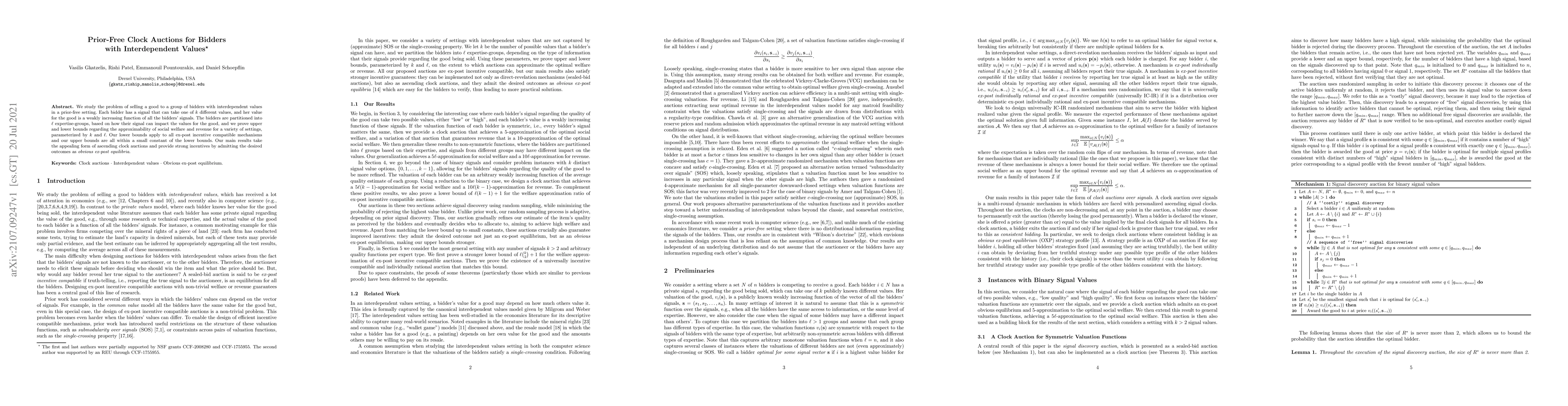 The paper studies the problem of selling a good to bidders with interdependent values in a prior-free setting, using clock auctions and proving bounds for social welfare and revenue approximations.