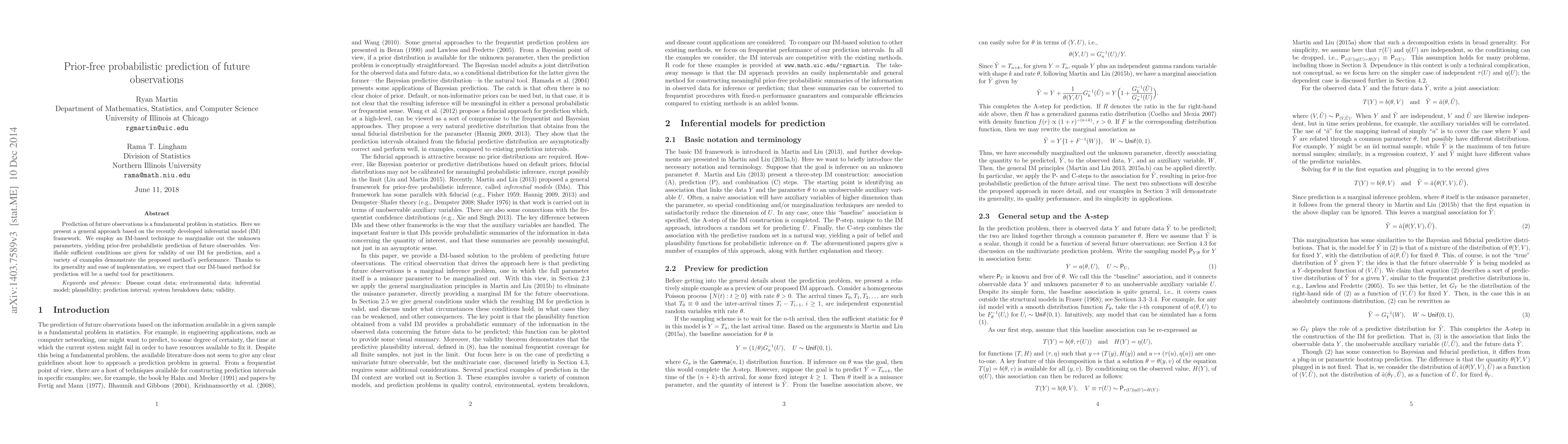 Prediction of future observations is a fundamental problem in statistics. Here we present a general approach based on the recently developed inferential model (IM) framework. We employ an IM-based technique to marginalize out the unknown parameters, yielding prior-free probabilistic prediction of future observables. Verifiable sufficient conditions are given for validity of our IM for prediction, and a variety of examples demonstrate the proposed method's performance. Thanks to its generality and ease of implementation, we expect that our IM-based method for prediction will be a useful tool for practitioners.