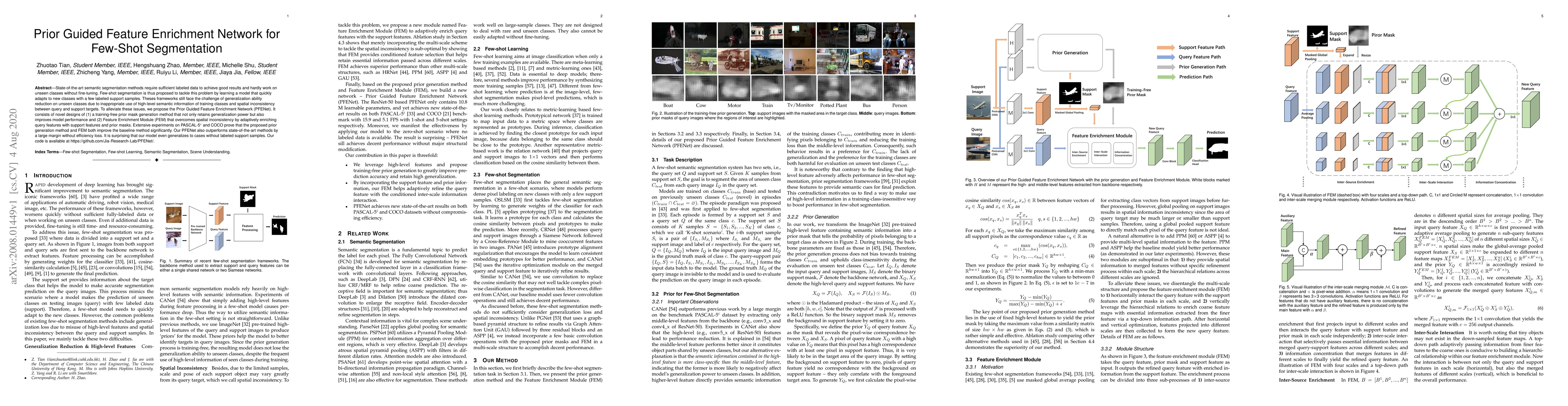 The Prior Guided Feature Enrichment Network (PFENet) addresses the challenge of few-shot segmentation by introducing a training-free prior mask generation method and a Feature Enrichment Module to enhance generalization and spatial consistency. Experiments show significant improvements over baselines and state-of-the-art methods on PASCAL-5$^i$ and COCO datasets.