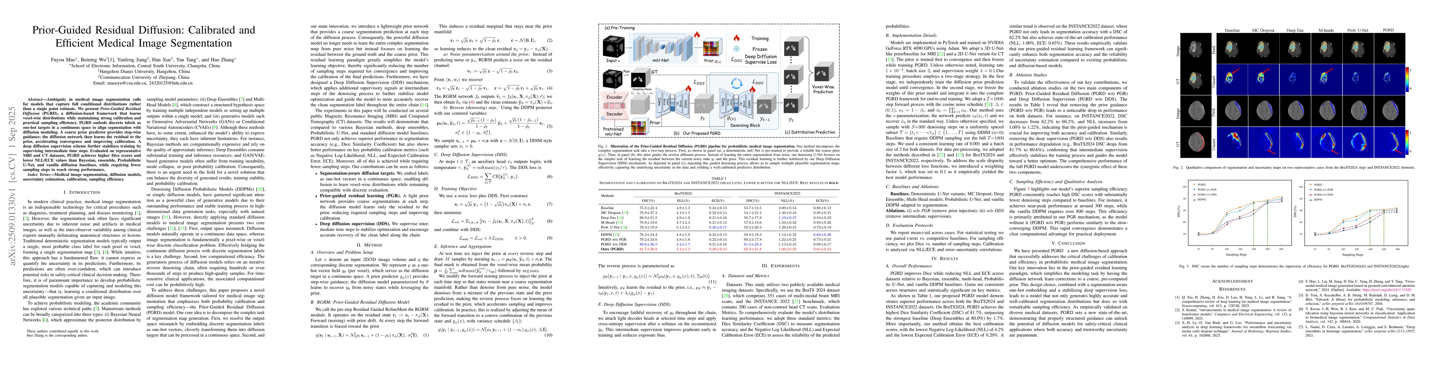 Ambiguity in medical image segmentation calls for models that capture full conditional distributions rather than a single point estimate. We present Prior-Guided Residual Diffusion (PGRD), a diffusion-based framework that learns voxel-wise distributions while maintaining strong calibration and practical sampling efficiency. PGRD embeds discrete labels as one-hot targets in a continuous space to align segmentation with diffusion modeling. A coarse prior predictor provides step-wise guidance; the diffusion network then learns the residual to the prior, accelerating convergence and improving calibration. A deep diffusion supervision scheme further stabilizes training by supervising intermediate time steps. Evaluated on representative MRI and CT datasets, PGRD achieves higher Dice scores and lower NLL/ECE values than Bayesian, ensemble, Probabilistic U-Net, and vanilla diffusion baselines, while requiring fewer sampling steps to reach strong performance.