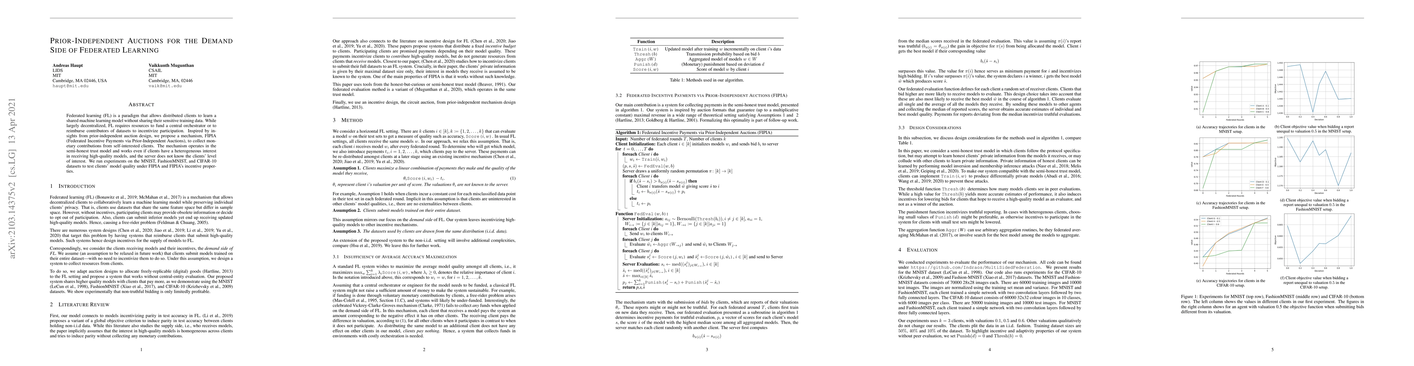 Federated learning (FL) is a paradigm that allows distributed clients to learn a shared machine learning model without sharing their sensitive training data. While largely decentralized, FL requires resources to fund a central orchestrator or to reimburse contributors of datasets to incentivize participation. Inspired by insights from prior-independent auction design, we propose a mechanism, FIPIA (Federated Incentive Payments via Prior-Independent Auctions), to collect monetary contributions from self-interested clients. The mechanism operates in the semi-honest trust model and works even if clients have a heterogeneous interest in receiving high-quality models, and the server does not know the clients' level of interest. We run experiments on the MNIST, FashionMNIST, and CIFAR-10 datasets to test clients' model quality under FIPIA and FIPIA's incentive properties.