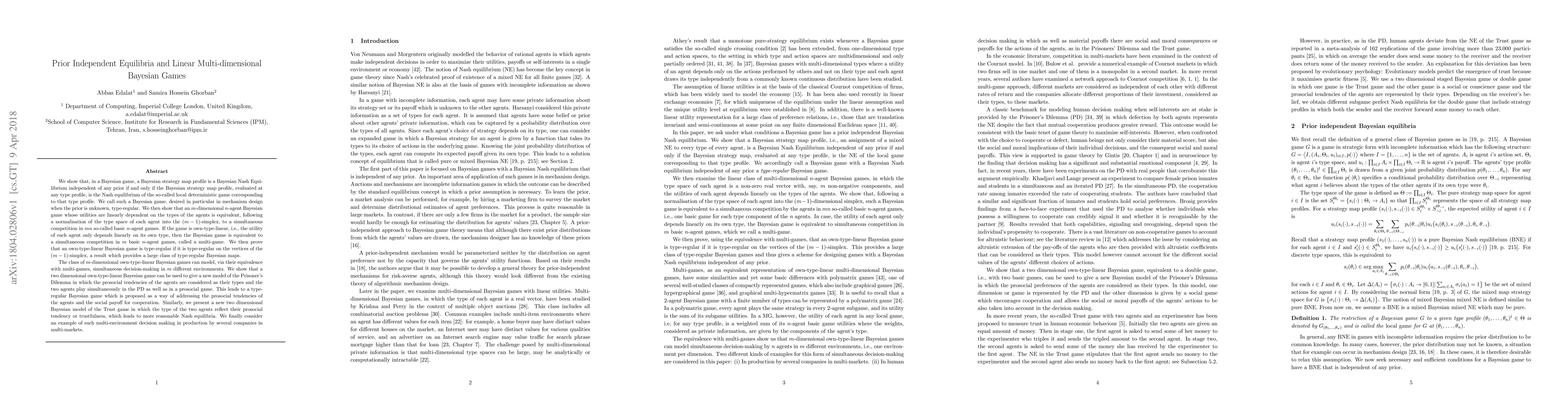 We show that a Bayesian strategy map profile is a Bayesian Nash Equilibrium independent of any prior if and only if the Bayesian strategy map profile, evaluated at any type profile, is the Nash equilibrium of the so-called local deterministic game corresponding to that type profile. We call such a Bayesian game type-regular. We then show that an m-dimensional n-agent Bayesian game whose utilities are linearly dependent on the types of the agents is equivalent, following a normalisation of the type space of each agent into the (m-1)-simplex, to a simultaneous competition in nm so-called basic n-agent games. If the game is own-type-linear, i.e., the utility of each player only depends linearly on its own type, then the Bayesian game is equivalent to a simultaneous competition in m basic n-agent games, called a multi-game. We then prove that an own-type-linear Bayesian game is type-regular if it is type-regular on the vertices of the (m-1)-simplex, a result which provides a large class of type-regular Bayesian maps. The class of m-dimensional own-type-linear Bayesian games can model, via their equivalence with multi-games, simultaneous decision-making in m different environments. We show that a two dimensional own-type-linear Bayesian game can be used to give a new model of the Prisoner's Dilemma (PD) in which the prosocial tendencies of the agents are considered as their types and the two agents play simultaneously in the PD as well as in a prosocial game. This Bayesian game addresses the materialistic and the prosocial tendencies of the agents. Similarly, we present a new two dimensional Bayesian model of the Trust game in which the type of the two agents reflect their prosocial tendency or trustfulness, which leads to more reasonable Nash equilibria. We finally consider an example of such multi-environment decision making in production by several companies in multi-markets.