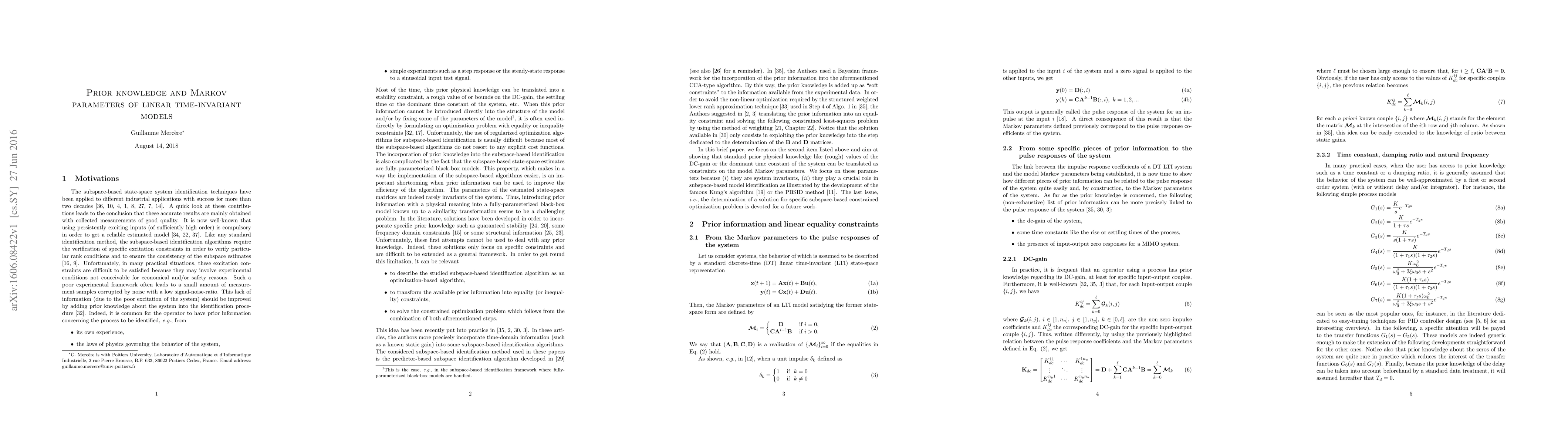 In many practical cases, the engineer has access to prior knowledge like rough values of the DC-gain or the main time constant of the system. In order to improve the accuracy of subspace-based identification techniques using the model Markov parameters, we derive in this short paper the direct links between these impulse response coefficients and this prior information. The next step will consist in introducing this prior knowledge explicitly in Kung's algorithm thank to dedicated equality and equality constraints.