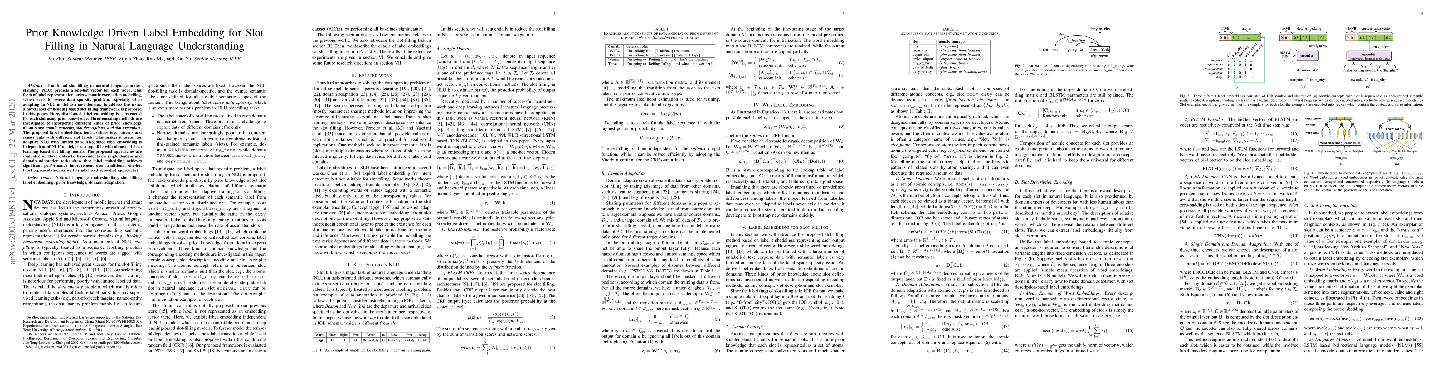 This paper proposes a label embedding framework for slot filling in NLU that uses prior knowledge to construct distributed label embeddings, addressing data sparsity issues. The method incorporates atomic concepts, slot descriptions, and exemplars, leading to improved performance over traditional one-hot representations and zero-shot approaches, especially in domain adaptation scenarios.