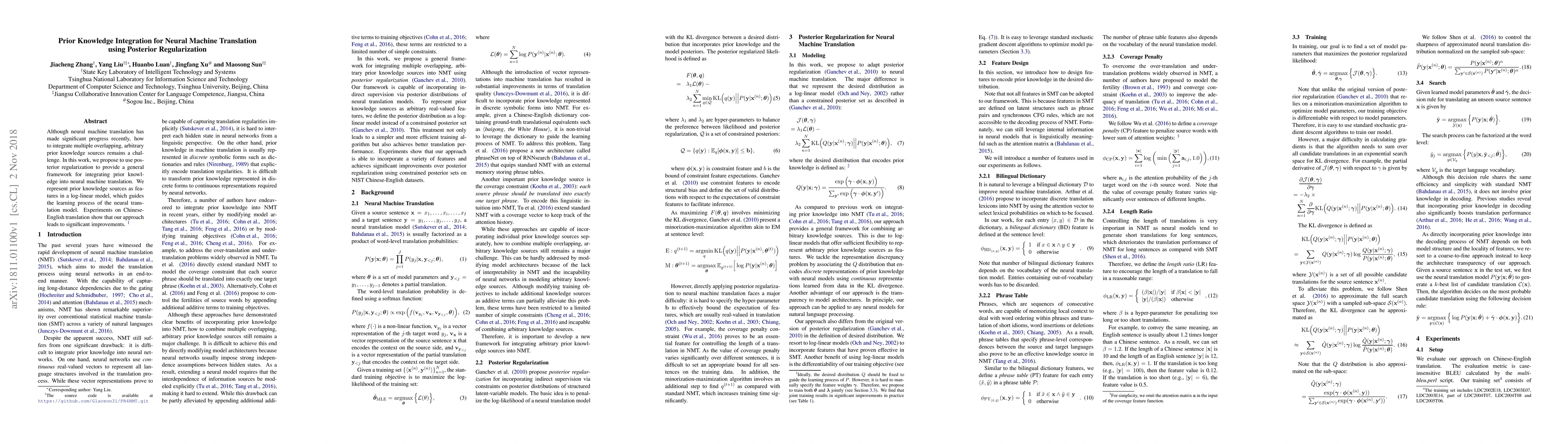 This paper proposes a method for integrating multiple prior knowledge sources into neural machine translation using posterior regularization. The approach represents prior knowledge as features in a log-linear model, enhancing the learning process of the translation model, and demonstrates significant improvements in Chinese-English translation.