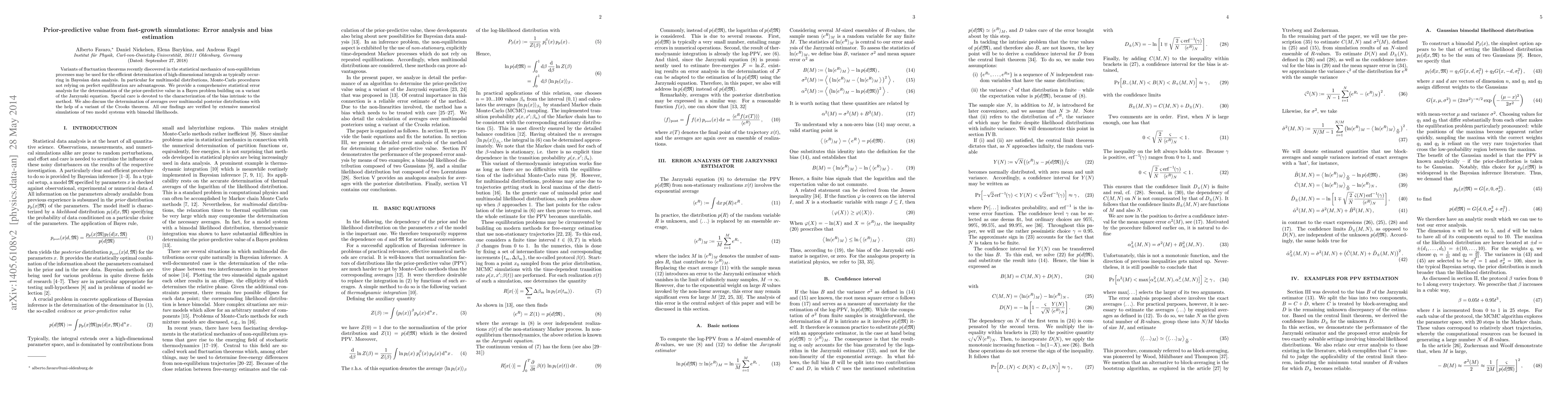 Variants of fluctuation theorems recently discovered in the statistical mechanics of non-equilibrium processes may be used for the efficient determination of high-dimensional integrals as typically occurring in Bayesian data analysis. In particular for multimodal distributions, Monte-Carlo procedures not relying on perfect equilibration are advantageous. We provide a comprehensive statistical error analysis for the determination of the prior-predictive value in a Bayes problem building on a variant of the Jarzynski equation. Special care is devoted to the characterization of the bias intrinsic to the method. We also discuss the determination of averages over multimodal posterior distributions with the help of a variant of the Crooks theorem. All our findings are verified by extensive numerical simulations of two model systems with bimodal likelihoods.