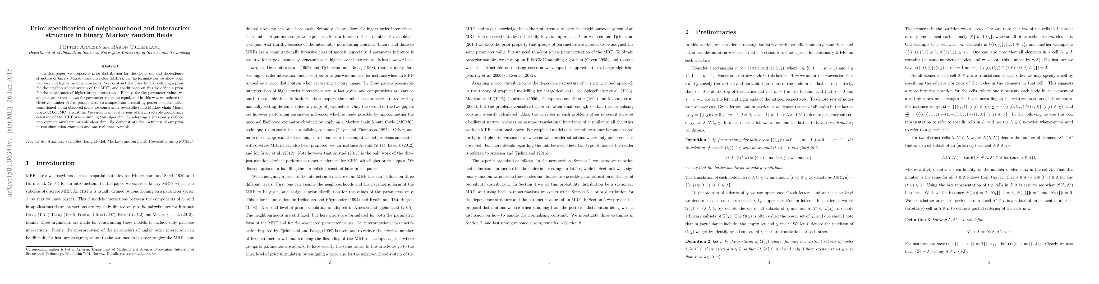 This paper proposes a prior distribution for binary Markov random fields that allows for both pairwise and higher-order interactions, reducing the effective number of parameters. It employs a reversible jump MCMC algorithm to sample from the posterior distribution, using an approximate auxiliary variable method to avoid intractable normalising constant evaluations.