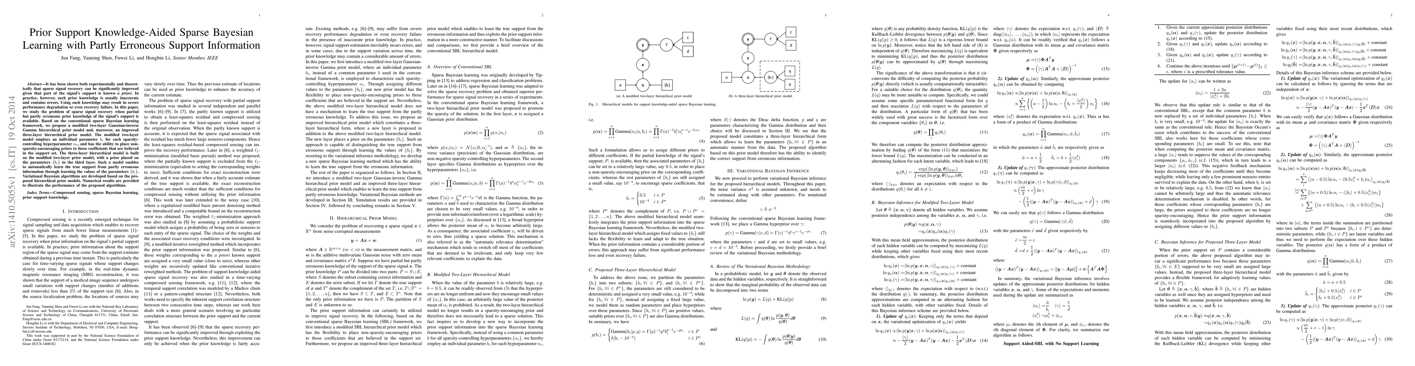 It has been shown both experimentally and theoretically that sparse signal recovery can be significantly improved given that part of the signal's support is known \emph{a priori}. In practice, however, such prior knowledge is usually inaccurate and contains errors. Using such knowledge may result in severe performance degradation or even recovery failure. In this paper, we study the problem of sparse signal recovery when partial but partly erroneous prior knowledge of the signal's support is available. Based on the conventional sparse Bayesian learning framework, we propose a modified two-layer Gaussian-inverse Gamma hierarchical prior model and, moreover, an improved three-layer hierarchical prior model. The modified two-layer model employs an individual parameter $b_i$ for each sparsity-controlling hyperparameter $\alpha_i$, and has the ability to place non-sparsity-encouraging priors to those coefficients that are believed in the support set. The three-layer hierarchical model is built on the modified two-layer prior model, with a prior placed on the parameters $\{b_i\}$ in the third layer. Such a model enables to automatically learn the true support from partly erroneous information through learning the values of the parameters $\{b_i\}$. Variational Bayesian algorithms are developed based on the proposed hierarchical prior models. Numerical results are provided to illustrate the performance of the proposed algorithms.