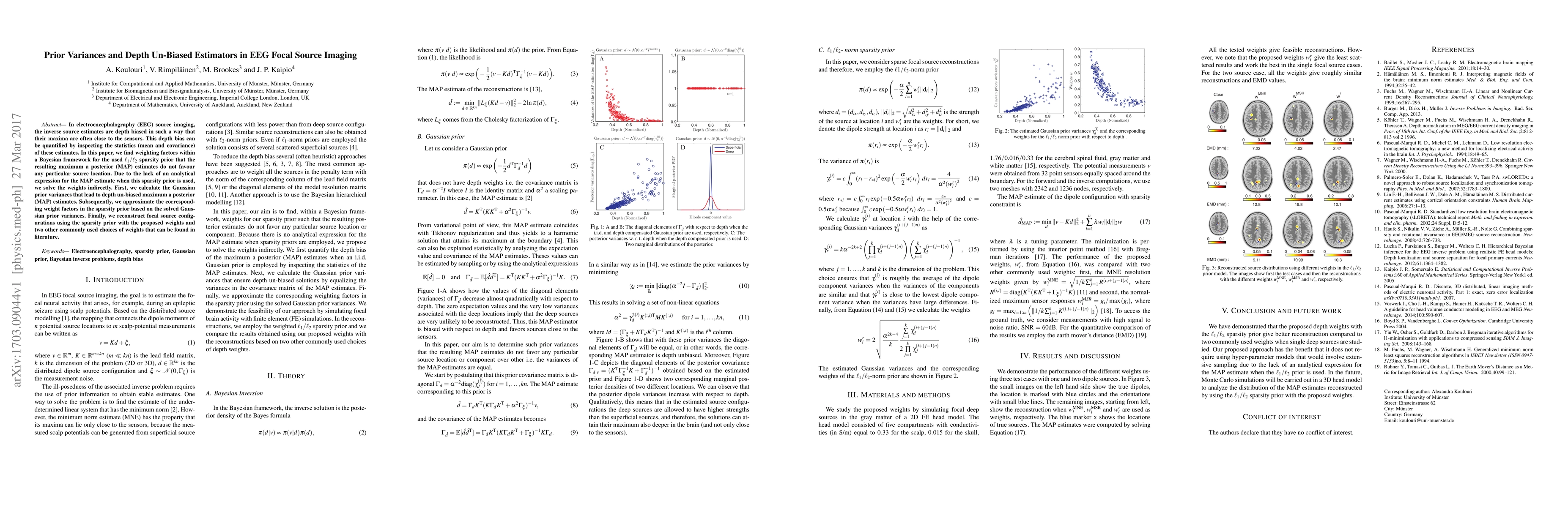 This paper addresses the depth bias in EEG source imaging by developing weighting factors within a Bayesian framework to create depth un-biased maximum a posterior (MAP) estimates. It proposes a method to calculate the Gaussian prior variances and approximate the corresponding weight factors, ultimately reconstructing focal source configurations without favoring any particular source location.
