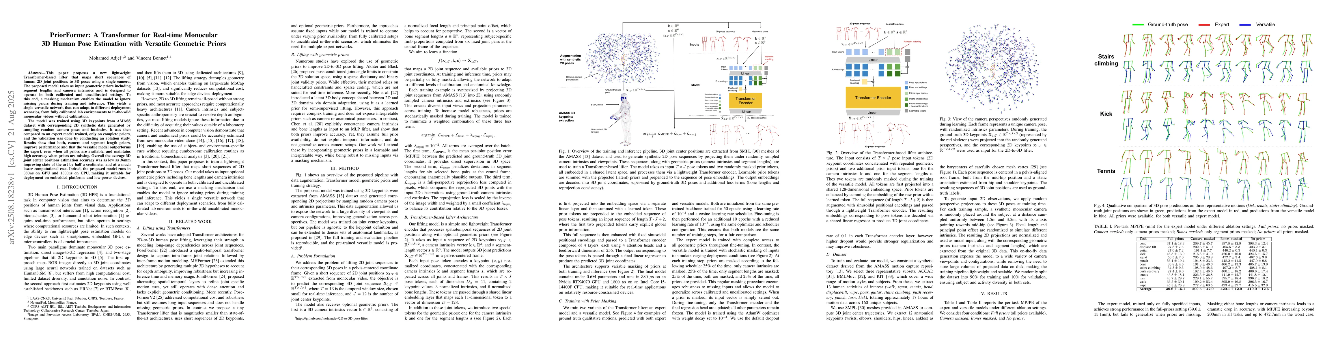This paper proposes a new lightweight Transformer-based lifter that maps short sequences of human 2D joint positions to 3D poses using a single camera. The proposed model takes as input geometric priors including segment lengths and camera intrinsics and is designed to operate in both calibrated and uncalibrated settings. To this end, a masking mechanism enables the model to ignore missing priors during training and inference. This yields a single versatile network that can adapt to different deployment scenarios, from fully calibrated lab environments to in-the-wild monocular videos without calibration. The model was trained using 3D keypoints from AMASS dataset with corresponding 2D synthetic data generated by sampling random camera poses and intrinsics. It was then compared to an expert model trained, only on complete priors, and the validation was done by conducting an ablation study. Results show that both, camera and segment length priors, improve performance and that the versatile model outperforms the expert, even when all priors are available, and maintains high accuracy when priors are missing. Overall the average 3D joint center positions estimation accuracy was as low as 36mm improving state of the art by half a centimeter and at a much lower computational cost. Indeed, the proposed model runs in 380$\mu$s on GPU and 1800$\mu$s on CPU, making it suitable for deployment on embedded platforms and low-power devices.