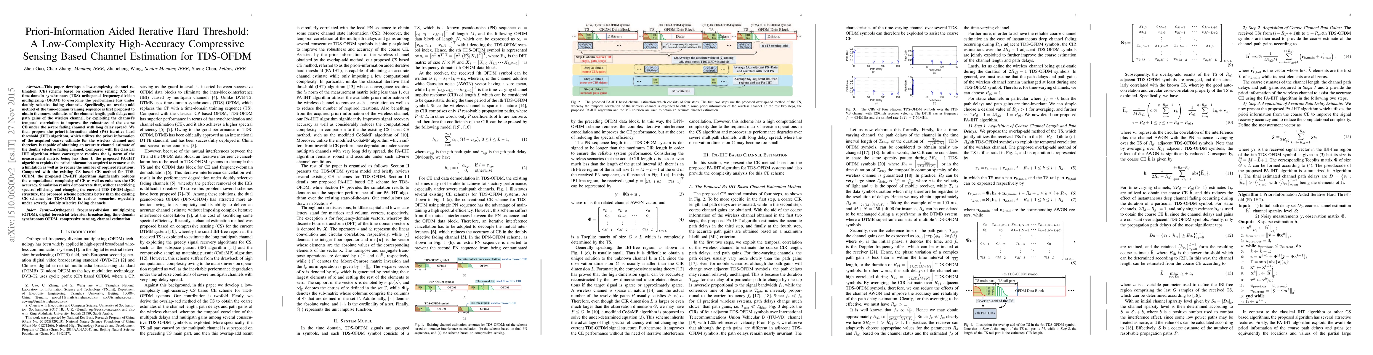 This paper proposes a low-complexity, high-accuracy channel estimation scheme for TDS-OFDM based on compressive sensing, utilizing an overlap-add method for initial estimates and a priori-information aided iterative hard threshold algorithm to enhance accuracy and reduce computational complexity. The proposed method outperforms existing schemes, especially under doubly selective fading channels.