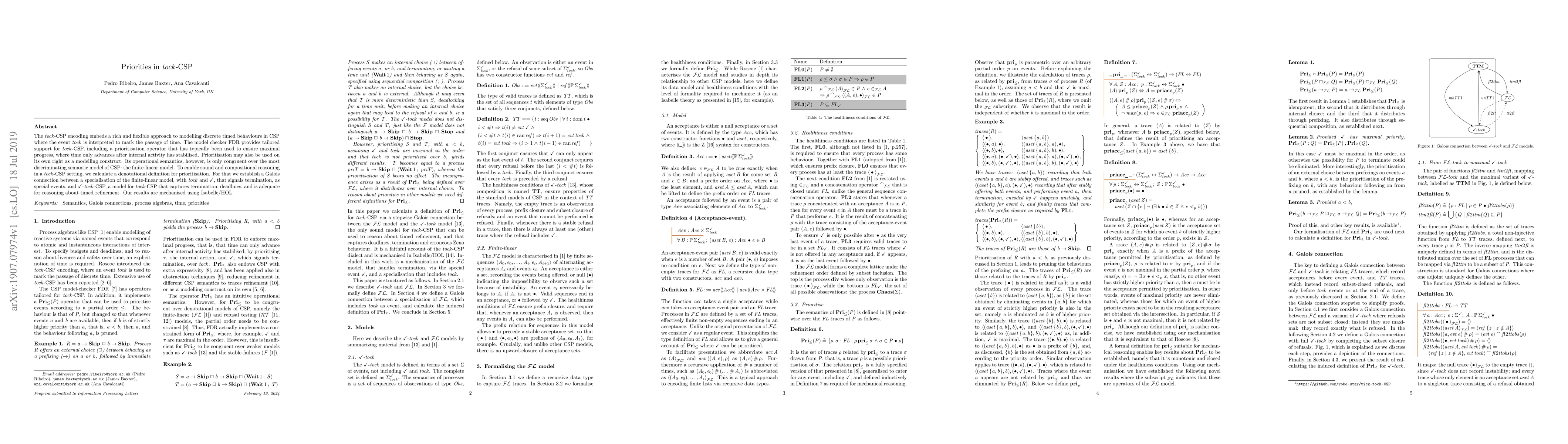 The paper presents a $tock$-CSP encoding for modelling discrete timed behaviours, focusing on the prioritisation operator for ensuring maximal progress in model checking. It establishes a denotational definition for prioritisation through a Galois connection between a finite-linear model and $\checkmark$-$tock$-CSP, enabling compositional reasoning and is mechanised in Isabelle/HOL.