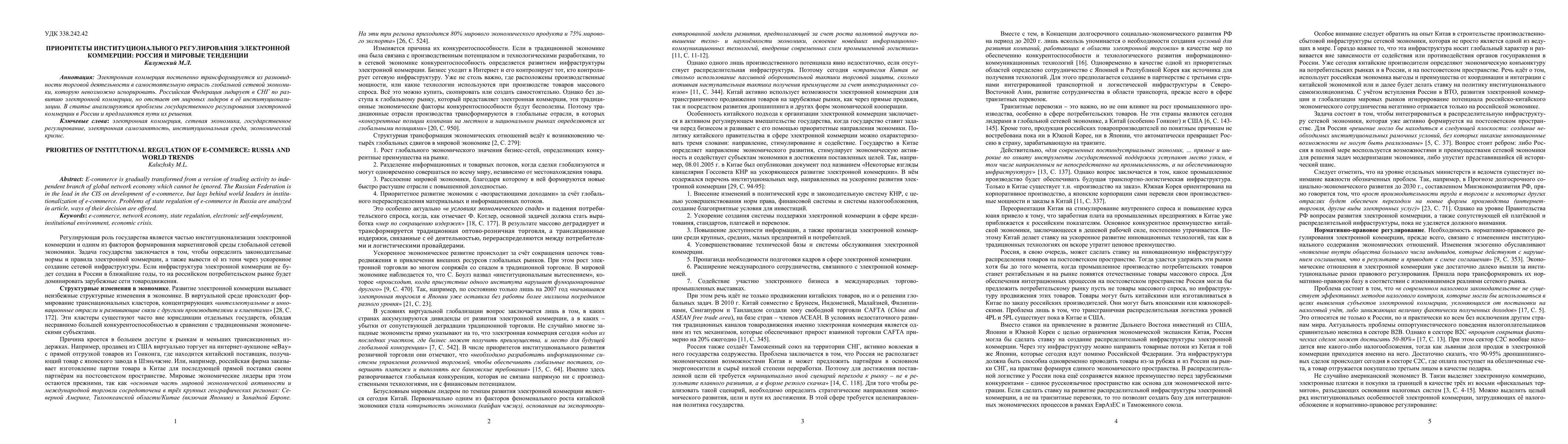 This paper examines the evolving role of e-commerce as a significant part of the global network economy, highlighting Russia's leading position in the CIS but its lag in institutionalizing e-commerce compared to global leaders. It analyzes current regulatory issues in Russia and proposes solutions for effective state regulation.