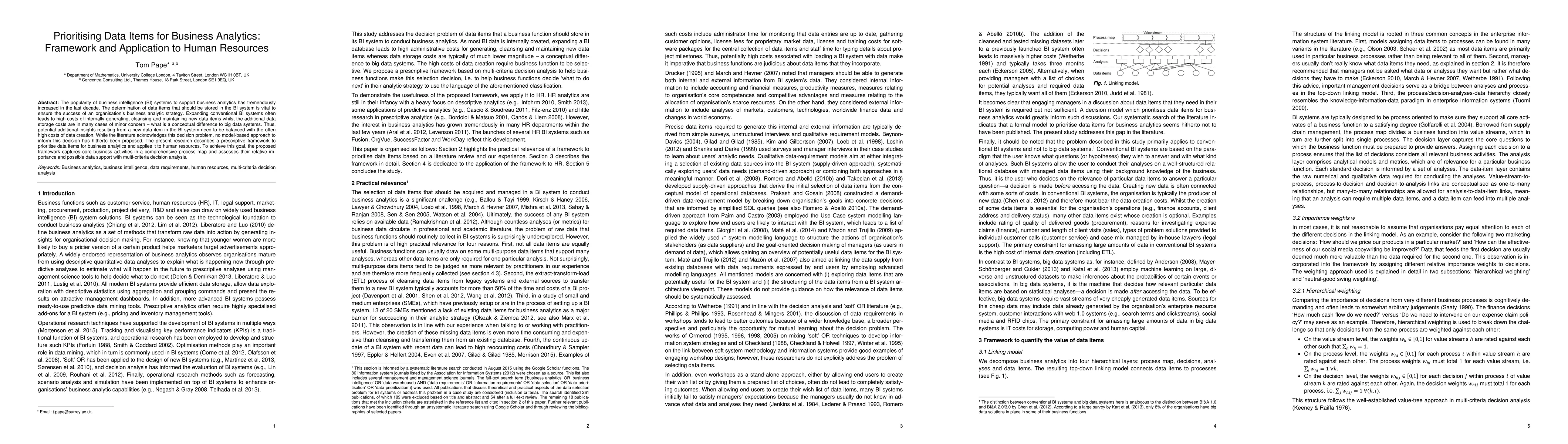 This paper presents a framework for prioritizing data items for business analytics, emphasizing the balance between potential insights and high costs of data creation. It applies the framework to human resources, using multi-criteria decision analysis to assess the relative importance of core business activities and their data support needs.