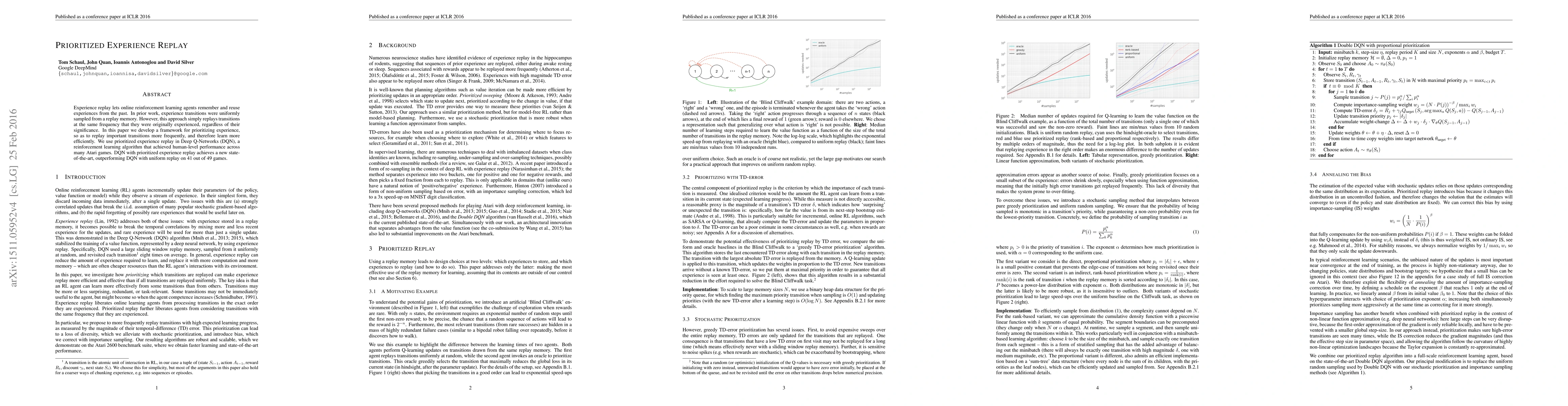 This paper introduces prioritized experience replay, a method that replays important transitions more frequently than less significant ones in reinforcement learning, enhancing Deep Q-Networks' performance. This approach results in state-of-the-art performance on 41 out of 49 Atari games compared to traditional uniform replay.
