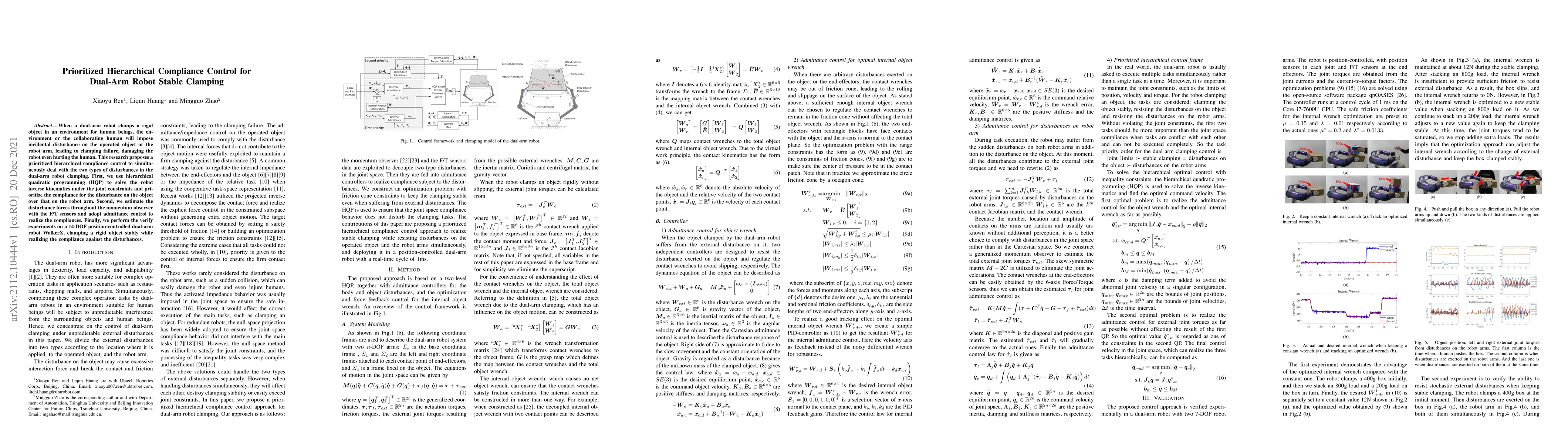 This research proposes a prioritized hierarchical compliance control method for dual-arm robots to maintain stable clamping despite incidental disturbances. The method uses hierarchical quadratic programming to prioritize compliance for object disturbances over arm disturbances, and employs admittance control for disturbance force estimation and mitigation.