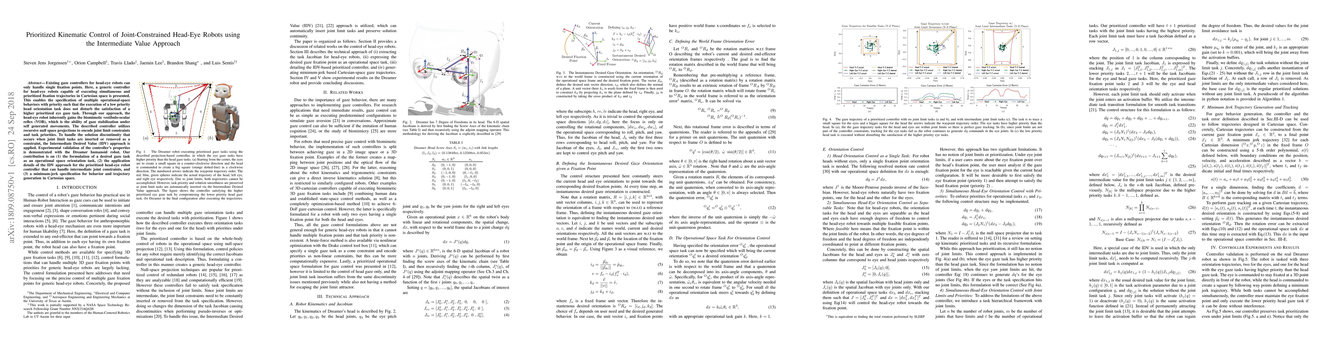 Existing gaze controllers for head-eye robots can only handle single fixation points. Here, a generic controller for head-eye robots capable of executing simultaneous and prioritized fixation trajectories in Cartesian space is presented. This enables the specification of multiple operational-space behaviors with priority such that the execution of a low priority head orientation task does not disturb the satisfaction of a higher prioritized eye gaze task. Through our approach, the head-eye robot inherently gains the biomimetic vestibulo-ocular reflex (VOR), which is the ability of gaze stabilization under self generated movements. The described controller utilizes recursive null space projections to encode joint limit constraints and task priorities. To handle the solution discontinuity that occurs when joint limit tasks are inserted or removed as a constraint, the Intermediate Desired Value (IDV) approach is applied. Experimental validation of the controller's properties is demonstrated with the Dreamer humanoid robot. Our contribution is on (1) the formulation of a desired gaze task as an operational space orientation task, (2) the application details of the IDV approach for the prioritized head-eye robot controller that can handle intermediate joint constraints, and (3) a minimum-jerk specification for behavior and trajectory generation in Cartesian space.