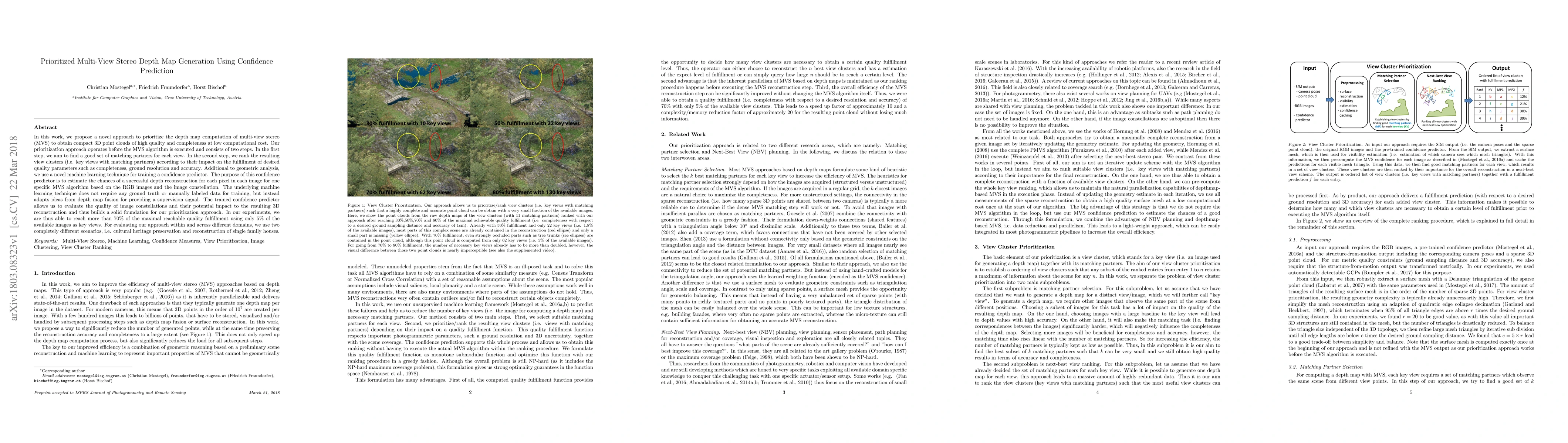 In this work, we propose a novel approach to prioritize the depth map computation of multi-view stereo (MVS) to obtain compact 3D point clouds of high quality and completeness at low computational cost. Our prioritization approach operates before the MVS algorithm is executed and consists of two steps. In the first step, we aim to find a good set of matching partners for each view. In the second step, we rank the resulting view clusters (i.e. key views with matching partners) according to their impact on the fulfillment of desired quality parameters such as completeness, ground resolution and accuracy. Additional to geometric analysis, we use a novel machine learning technique for training a confidence predictor. The purpose of this confidence predictor is to estimate the chances of a successful depth reconstruction for each pixel in each image for one specific MVS algorithm based on the RGB images and the image constellation. The underlying machine learning technique does not require any ground truth or manually labeled data for training, but instead adapts ideas from depth map fusion for providing a supervision signal. The trained confidence predictor allows us to evaluate the quality of image constellations and their potential impact to the resulting 3D reconstruction and thus builds a solid foundation for our prioritization approach. In our experiments, we are thus able to reach more than 70% of the maximal reachable quality fulfillment using only 5% of the available images as key views. For evaluating our approach within and across different domains, we use two completely different scenarios, i.e. cultural heritage preservation and reconstruction of single family houses.