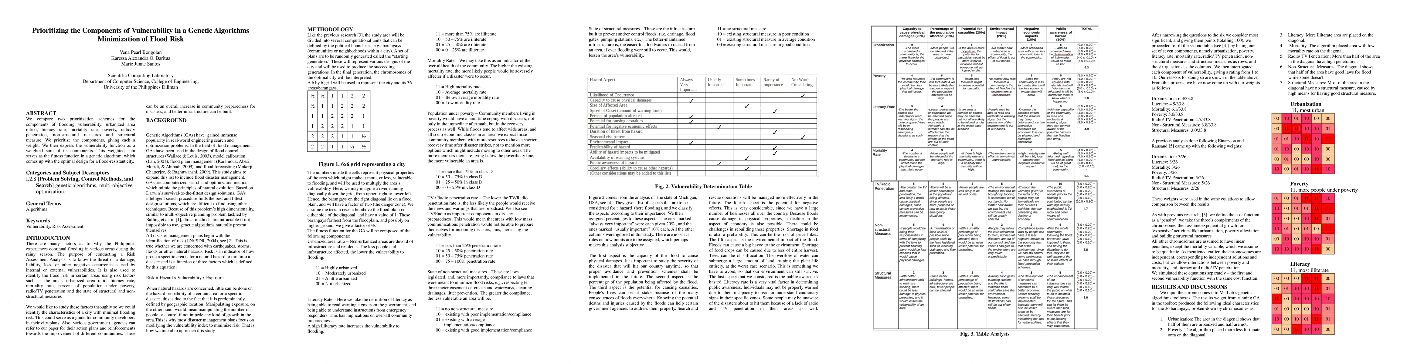 We compare two prioritization schemes for the components of flooding vulnerability: urbanized area ration, literacy rate, mortality rate, poverty, radio/tv penetration, non-structural measures and structural measure. We prioritize the components, giving each a weight. We then express the vulnerability function as a weighted sum of its components. This weighted sum serves as the fitness function in a genetic algorithm, which comes up with the optimal design for a flood-resistant city.