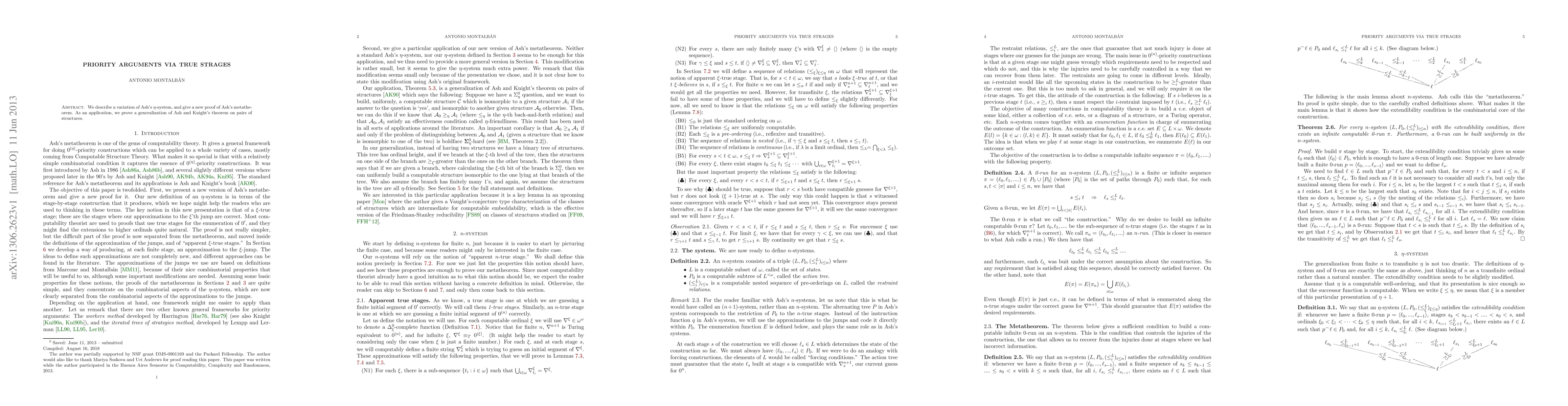 We describe a variation of Ash's $\eta$-system, and give a new proof of Ash's metatheorem. As an application, we prove a generalization of Ash and Knight's theorem on pairs of structures.