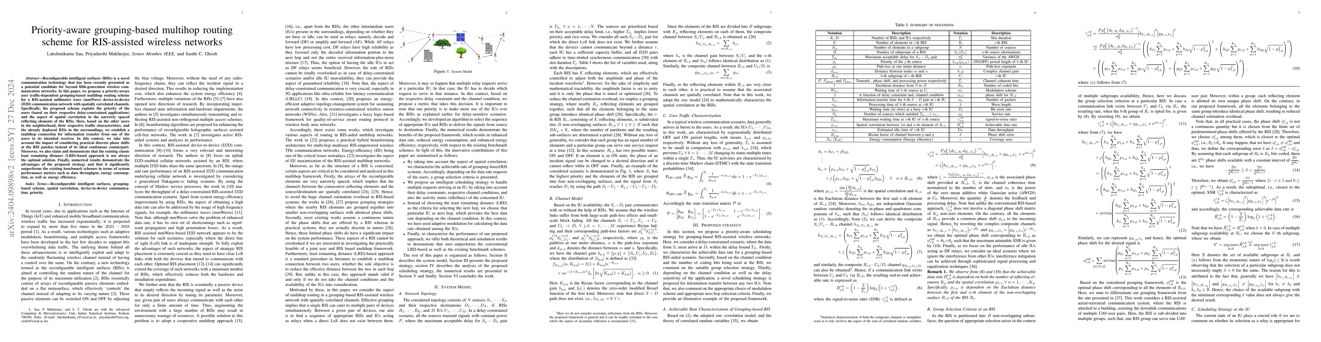 This paper proposes a priority aware multihop routing scheme for RIS-assisted mmWave D2D networks that considers user traffic characteristics and spatial correlations. It outperforms traditional LRD-based approaches in terms of data throughput, energy consumption, and efficiency.