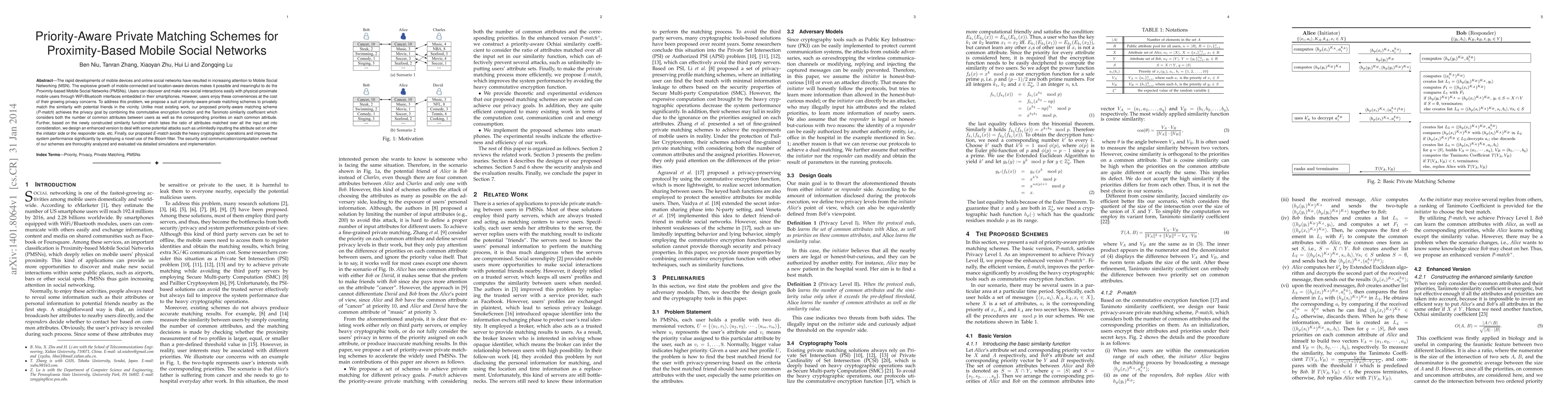 This paper proposes priority-aware private matching schemes for Proximity-based Mobile Social Networks (PMSNs) to address privacy concerns while facilitating social interactions. The proposed P-match scheme uses commutative encryption and Tanimoto similarity to match users based on attribute priorities, and an enhanced E-match version improves performance using Bloom filters.