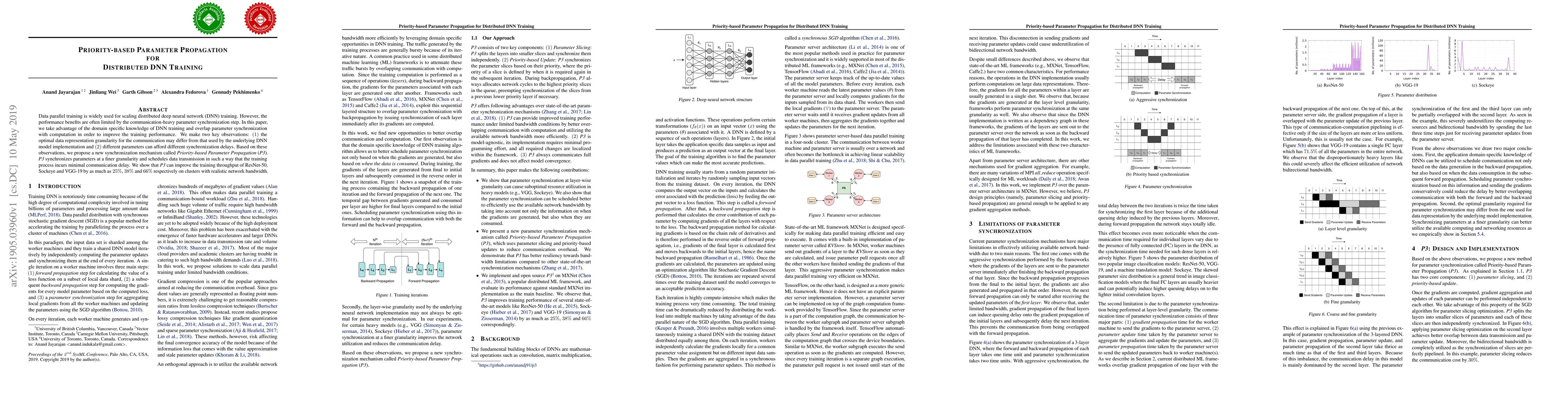 This paper proposes Priority-based Parameter Propagation (P3) to enhance distributed deep neural network training by optimizing parameter synchronization. It achieves this by synchronizing parameters at a finer granularity and scheduling transmissions to minimize communication delays, leading to significant improvements in training throughput for models like ResNet-50, Sockeye, and VGG-19.