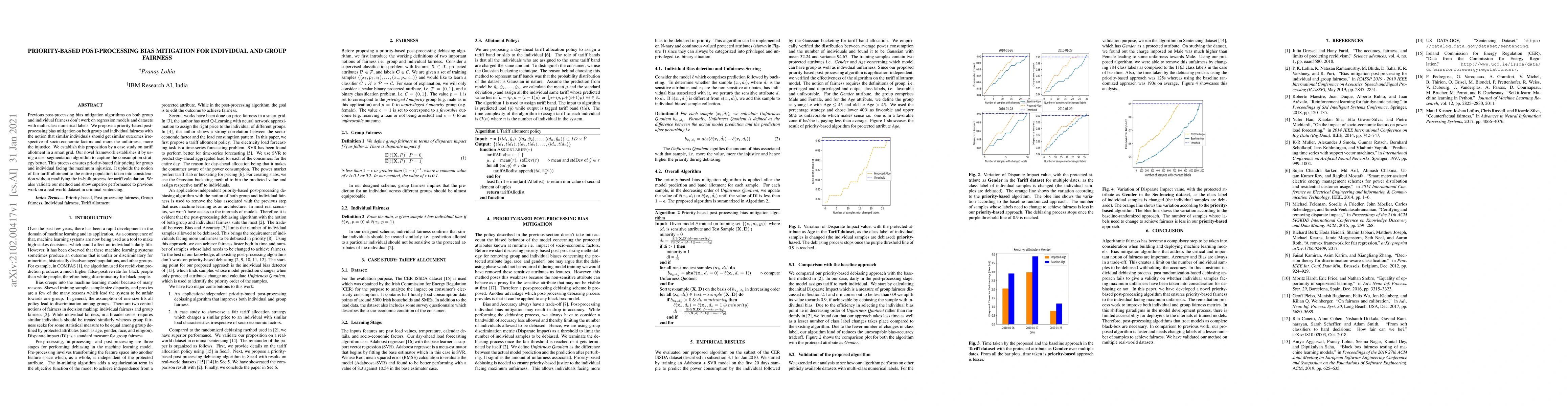 Previous post-processing bias mitigation algorithms on both group and individual fairness don't work on regression models and datasets with multi-class numerical labels. We propose a priority-based post-processing bias mitigation on both group and individual fairness with the notion that similar individuals should get similar outcomes irrespective of socio-economic factors and more the unfairness, more the injustice. We establish this proposition by a case study on tariff allotment in a smart grid. Our novel framework establishes it by using a user segmentation algorithm to capture the consumption strategy better. This process ensures priority-based fair pricing for group and individual facing the maximum injustice. It upholds the notion of fair tariff allotment to the entire population taken into consideration without modifying the in-built process for tariff calculation. We also validate our method and show superior performance to previous work on a real-world dataset in criminal sentencing.