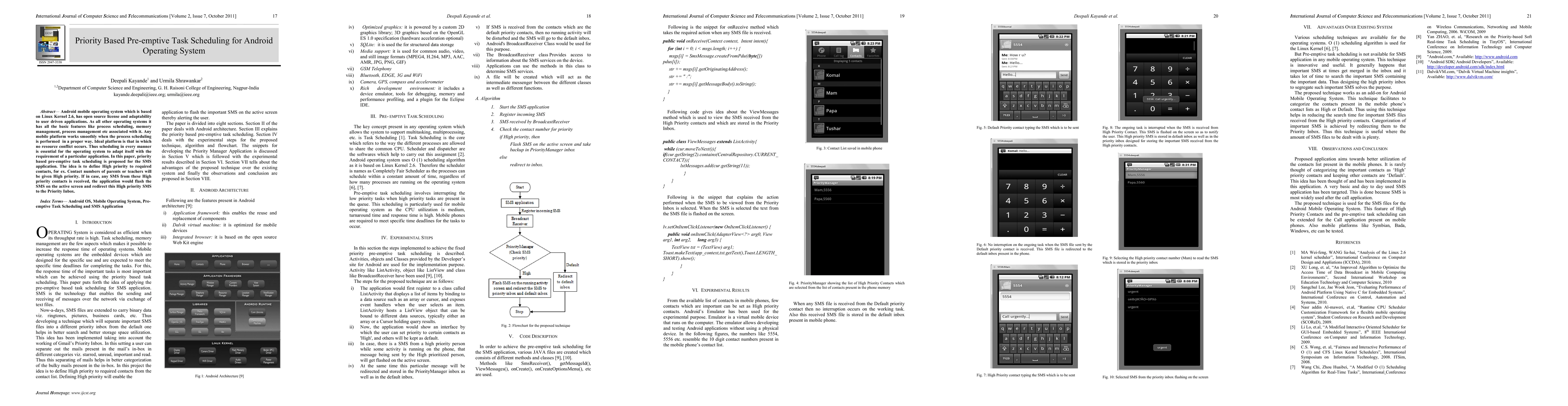 This paper proposes a priority-based pre-emptive task scheduling method for the Android OS to optimize SMS handling, prioritizing messages from important contacts to ensure timely notifications. The method aims to minimize resource conflicts and enhance user experience by flashing high-priority SMS on the active screen and directing them to a Priority Inbox.