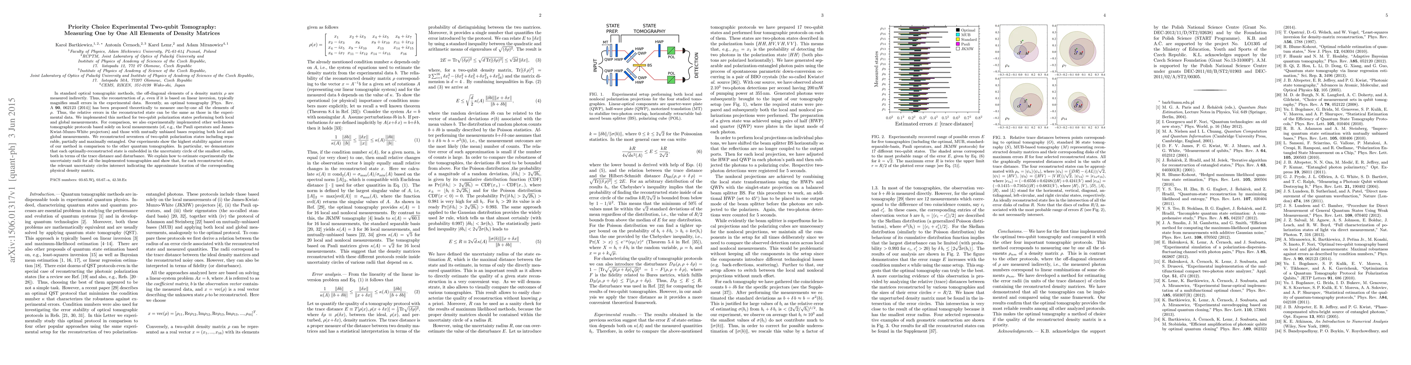 In standard optical tomographic methods, the off-diagonal elements of a density matrix $\rho$ are measured indirectly. Thus, the reconstruction of $\rho$, even if it is based on linear inversion, typically magnifies small errors in the experimental data. Recently, an optimal tomography [Phys. Rev. A 90, 062123 (2014)] has been proposed theoretically to measure one-by-one all the elements of $\rho$. Thus, the relative errors in the reconstructed state can be the same as those in the experimental data. We implemented this method for two-qubit polarization states performing both local and global measurements. For comparison, we also experimentally implemented other well-known tomographic protocols based solely on local measurements (of, e.g., the Pauli operators and James-Kwiat-Munro-White projectors) and those with mutually unbiased bases requiring both local and global measurements. We reconstructed seventeen of two-qubit polarization states including separable, partially and maximally entangled. Our experiments show the highest stability against errors of our method in comparison to the other quantum tomographies. In particular, we demonstrate that each optimally-reconstructed state} is embedded in the uncertainty circle of the smallest radius, both in terms of the trace distance and disturbance. We explain how to estimate experimentally the uncertainty radii for all the implemented tomographies and show that, for each reconstructed state, the relevant uncertainty circles intersect indicating the approximate location of the corresponding physical density matrix.