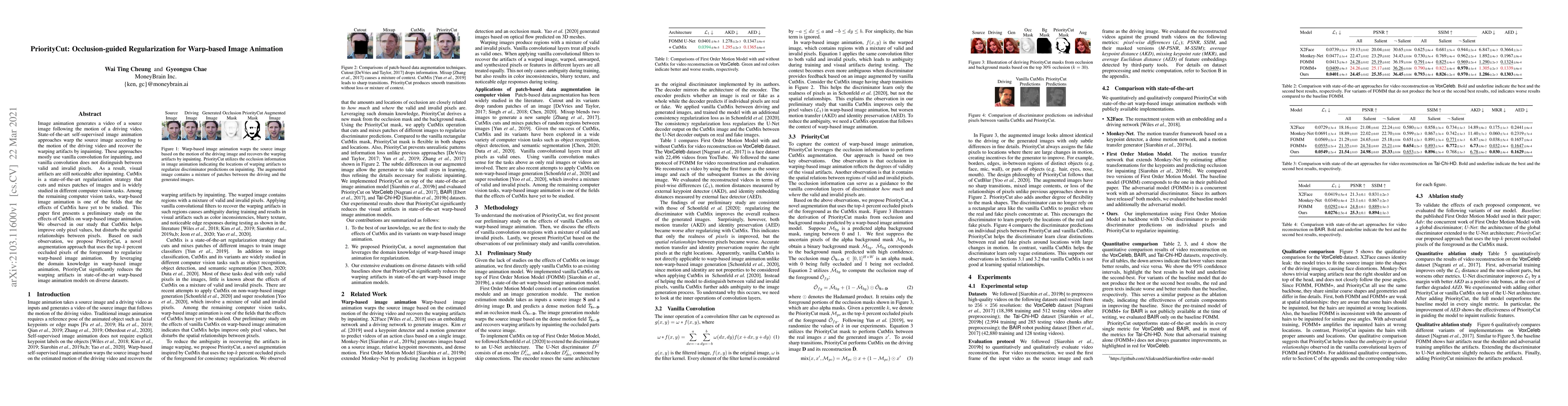 PriorityCut introduces a novel augmentation method using occluded pixels for regularization in warp-based image animation, significantly reducing artifacts compared to vanilla convolution and CutMix. This approach leverages domain-specific knowledge to improve spatial relationships and visual quality in animated images.