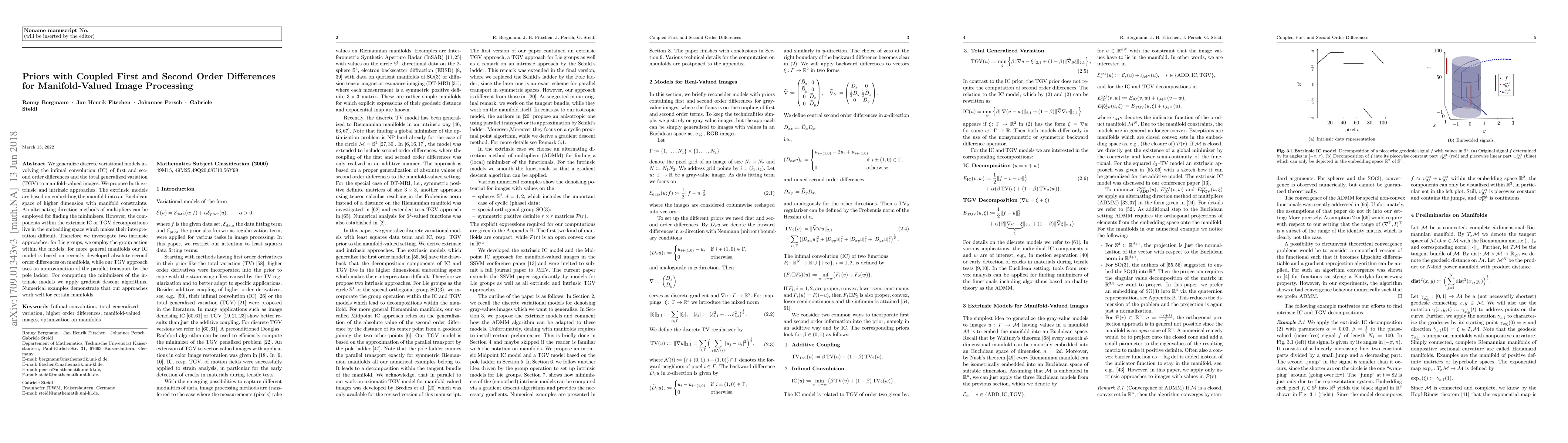 This paper introduces novel priors for manifold-valued image processing, generalizing existing models that use first and second order derivatives. The authors propose extrinsic and intrinsic approaches, with the latter being more suitable for manifold interpretation. They demonstrate effectiveness through numerical examples on various manifolds like circle, sphere, rotation group, and positive definite matrices.