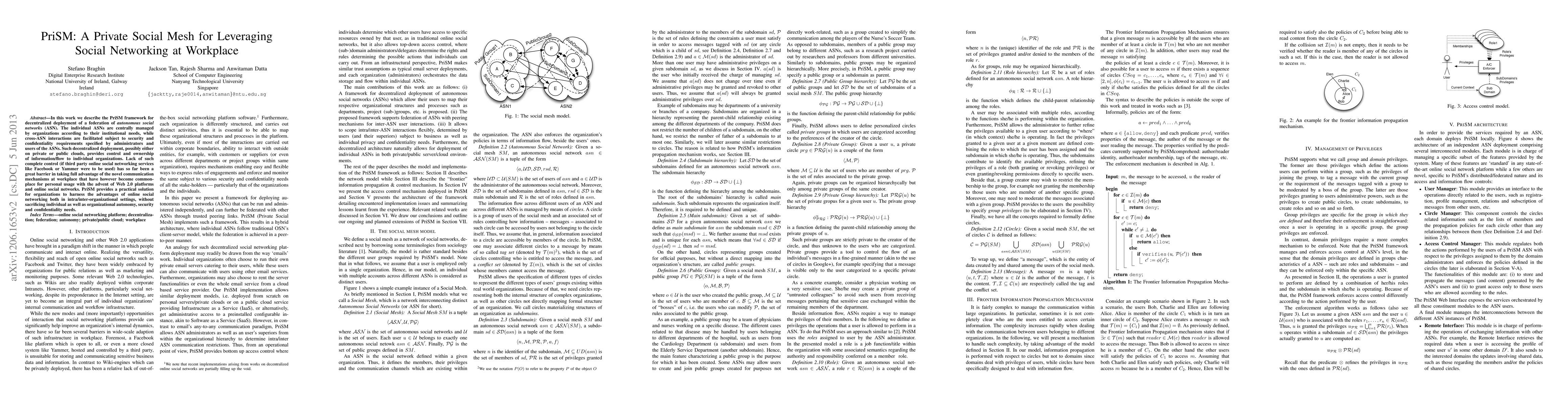 PriSM is a decentralized framework for deploying autonomous social networks within organizations, allowing control over data while facilitating secure cross-network interactions. It addresses the lack of autonomy in third-party social networks, enabling workplaces to leverage online social interactions securely.