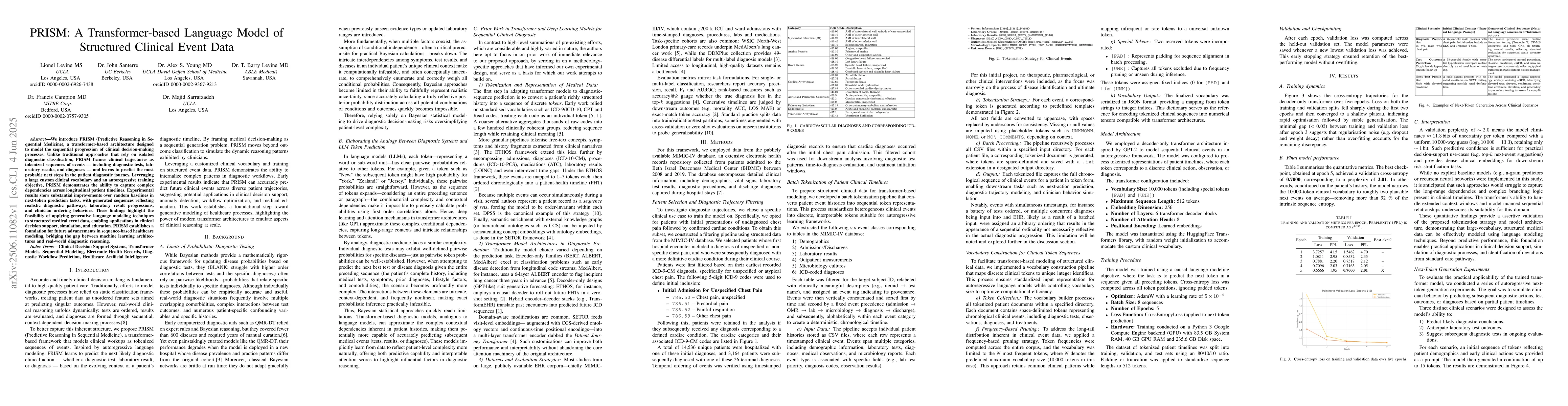 We introduce PRISM (Predictive Reasoning in Sequential Medicine), a transformer-based architecture designed to model the sequential progression of clinical decision-making processes. Unlike traditional approaches that rely on isolated diagnostic classification, PRISM frames clinical trajectories as tokenized sequences of events - including diagnostic tests, laboratory results, and diagnoses - and learns to predict the most probable next steps in the patient diagnostic journey. Leveraging a large custom clinical vocabulary and an autoregressive training objective, PRISM demonstrates the ability to capture complex dependencies across longitudinal patient timelines. Experimental results show substantial improvements over random baselines in next-token prediction tasks, with generated sequences reflecting realistic diagnostic pathways, laboratory result progressions, and clinician ordering behaviors. These findings highlight the feasibility of applying generative language modeling techniques to structured medical event data, enabling applications in clinical decision support, simulation, and education. PRISM establishes a foundation for future advancements in sequence-based healthcare modeling, bridging the gap between machine learning architectures and real-world diagnostic reasoning.