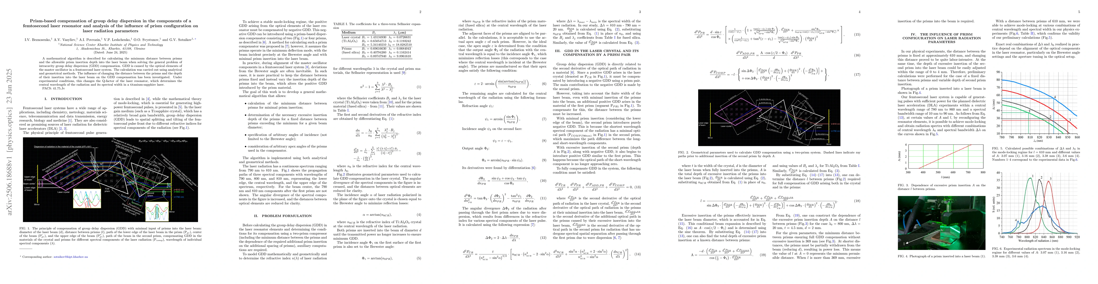 A mathematical algorithm is described for calculating the minimum distance between prisms and the allowable prism insertion depth into the laser beam when solving the general problem of intracavity group delay dispersion (GDD) compensation. GDD is caused by the optical elements of the master oscillator in a femtosecond laser system. The calculation was carried out using analytical and geometrical methods. The influence of changing the distance between the prisms and the depth of their insertion into the laser beam on the GDD compensation has been investigated. Under experimental conditions, this changes the Q-factor of the laser resonator, which determines the central wavelength of the radiation and its spectral width in a titanium-sapphire laser.
