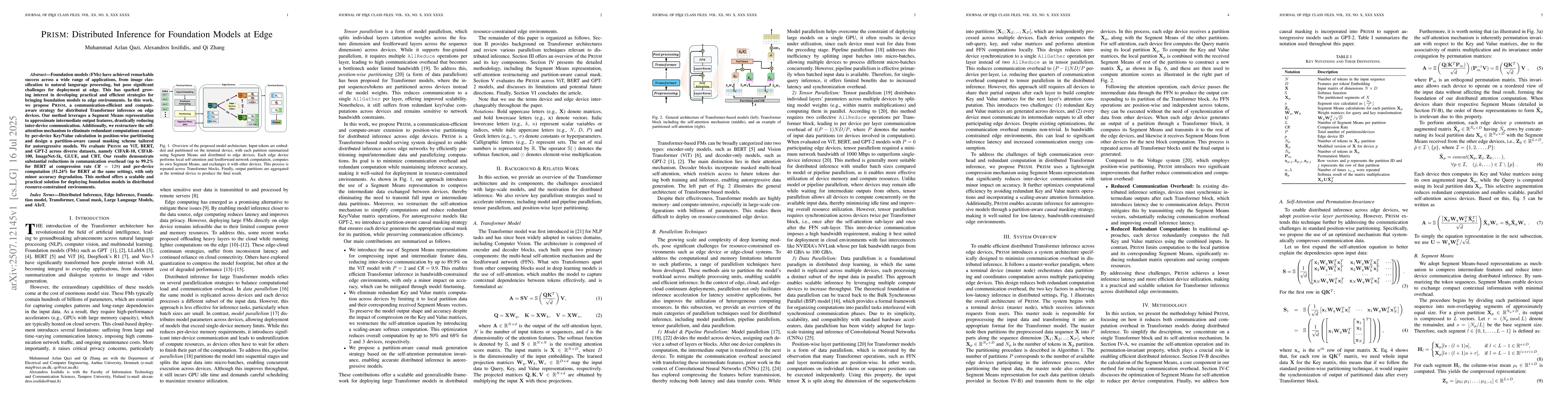 Foundation models (FMs) have achieved remarkable success across a wide range of applications, from image classification to natural langurage processing, but pose significant challenges for deployment at edge. This has sparked growing interest in developing practical and efficient strategies for bringing foundation models to edge environments. In this work, we propose PRISM, a communication-efficient and compute-aware strategy for distributed Transformer inference on edge devices. Our method leverages a Segment Means representation to approximate intermediate output features, drastically reducing inter-device communication. Additionally, we restructure the self-attention mechanism to eliminate redundant computations caused by per-device Key/Value calculation in position-wise partitioning and design a partition-aware causal masking scheme tailored for autoregressive models. We evaluate PRISM on ViT, BERT, and GPT-2 across diverse datasets, namely CIFAR-10, CIFAR-100, ImageNet-1k, GLUE, and CBT. Our results demonstrate substantial reductions in communication overhead (up to 99.2% for BERT at compression rate CR = 128) and per-device computation (51.24% for BERT at the same setting), with only minor accuracy degradation. This method offers a scalable and practical solution for deploying foundation models in distributed resource-constrained environments.