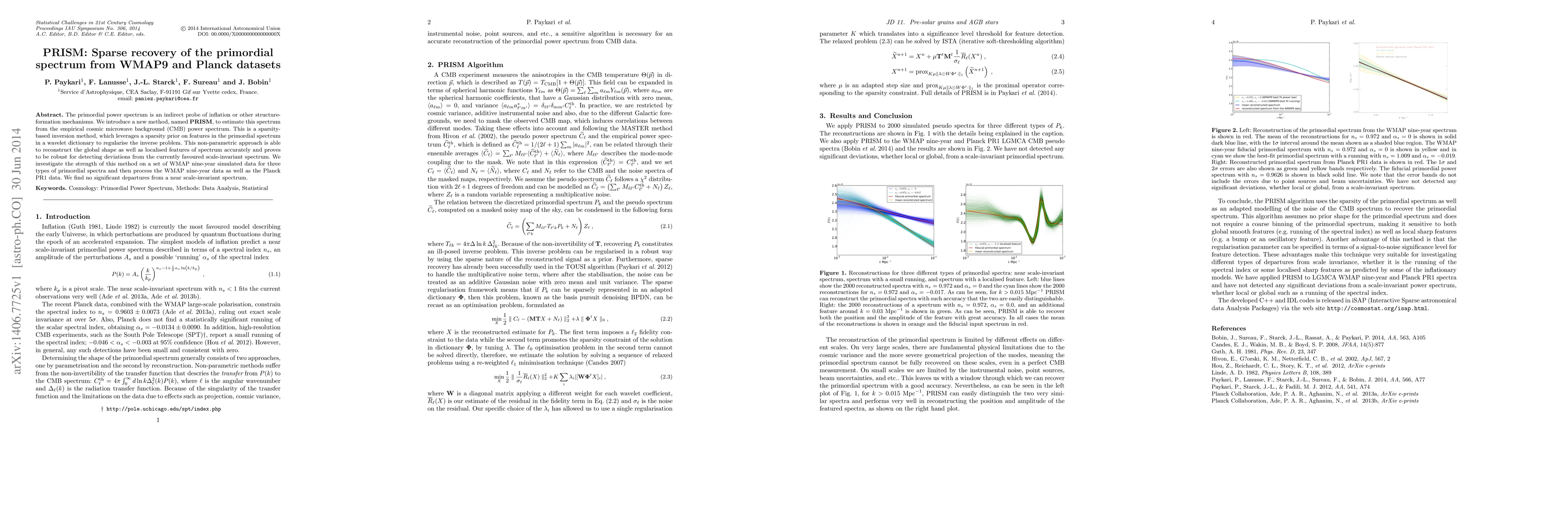 PRISM is a new sparsity-based method for estimating the primordial power spectrum from CMB data, demonstrating robust reconstruction of both global and localised features. Applied to WMAP9 and Planck datasets, it shows no significant deviations from a scale-invariant spectrum.