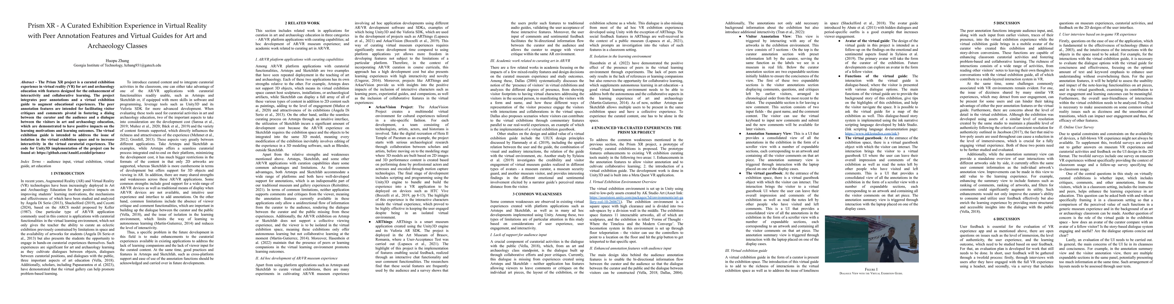 The Prism XR project enhances art and archaeology education in VR with peer annotations and a virtual guide, promoting interactivity, collaborative learning, and improved learning outcomes through visitor critiques and dialogues. The virtual guide aims to mitigate isolation and boost engagement in the virtual exhibition space.