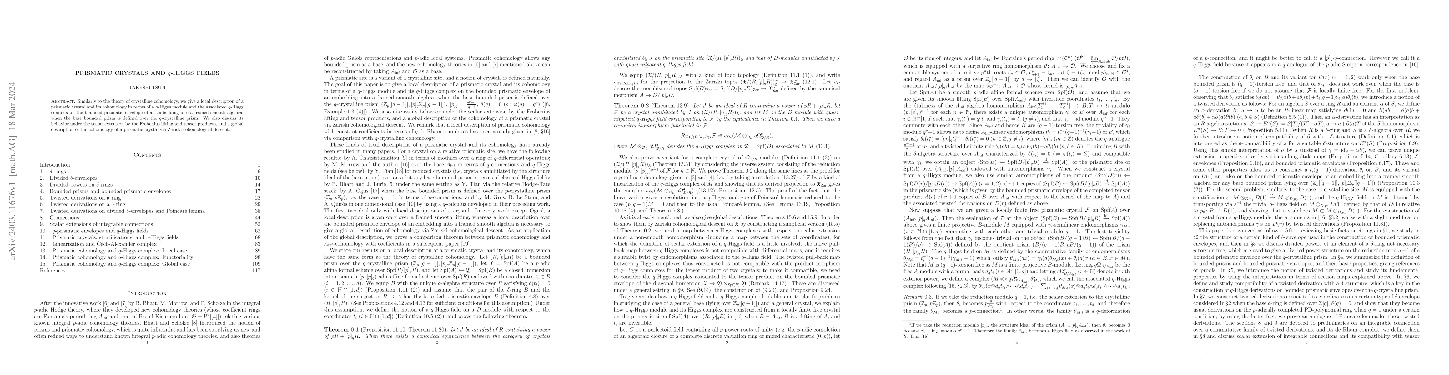 This paper presents a local description of prismatic crystals and their cohomology using $q$-Higgs modules, along with a global view of their cohomology through Zariski cohomological descent, and explores their behavior under scalar extensions and tensor products.