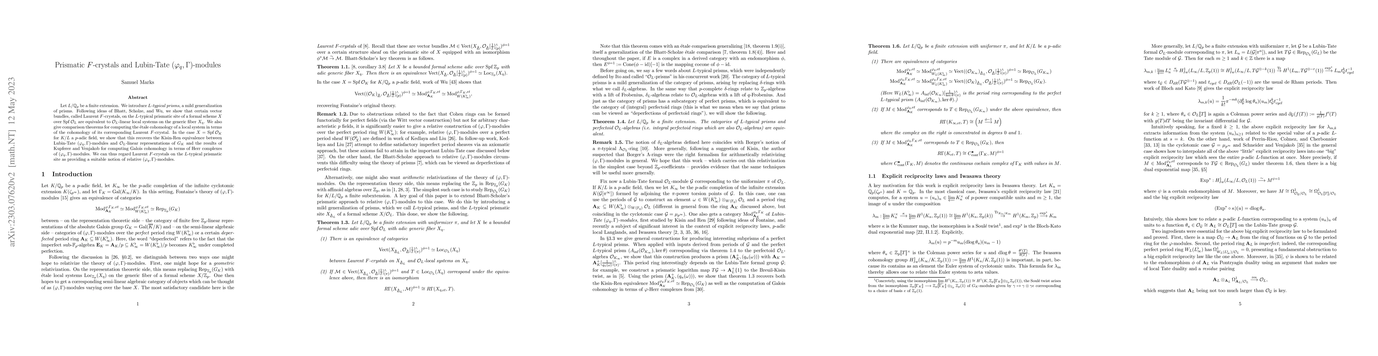 This paper generalizes the concept of prisms to $L$-typical prisms and shows their equivalence to $\mathcal{O}_L$-linear local systems on the generic fiber. It also establishes a connection between Laurent $F$-crystals and Lubin-Tate $(\varphi_q,\Gamma)$-modules, linking Galois cohomology computations to $(\varphi_q,\Gamma)$-modules via Herr complexes.