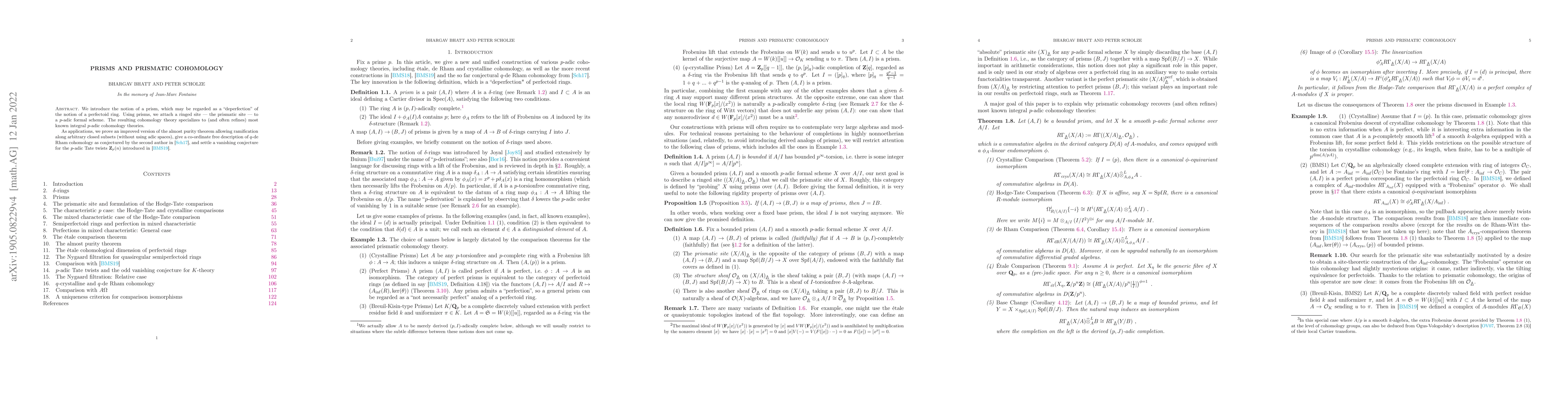 Summary: This paper introduces prisms, a generalization of perfectoid rings, and develops a prismatic cohomology theory attached to $p$-adic formal schemes. It refines existing integral $p$-adic cohomology and proves an improved almost purity theorem, a coordinate-free description of $q$-de Rham cohomology, and a vanishing conjecture for $p$-adic Tate twists.