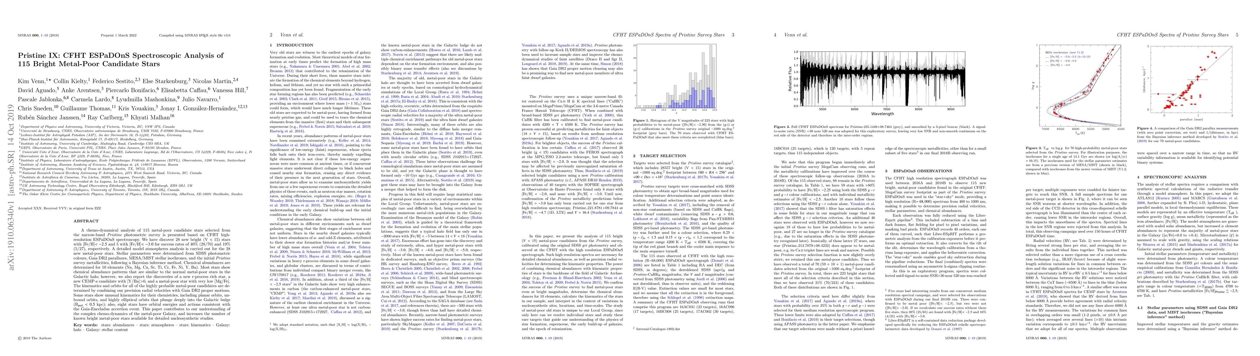 A chemo-dynamical analysis of 115 metal-poor candidate stars selected from the narrow-band Pristine photometric survey is presented based on CFHT high-resolution ESPaDoNS spectroscopy. We have discover 28 new bright (V < 15) stars with [Fe/H]<-2.5 and 5 with [Fe/H]<-3.0 for success rates of 40% (28/70) and 19% (5/27), respectively. A detailed model atmospheres analysis is carried out for the 28 new metal-poor stars. Stellar parameters were determined from SDSS photometric colours, Gaia DR2 parallaxes, MESA/MIST stellar isochrones, and the initial Pristine survey metallicities, following a Bayesian inference method. Chemical abundances are determined for 10 elements (Na, Mg, Ca, Sc, Ti, Cr, Fe, Ni, Y, Ba). Most stars show chemical abundance patterns that are similar to the normal metal-poor stars in the Galactic halo; however, we also report the discoveries of a new r-process rich star, a new CEMP-s candidate with [Y/Ba]>0, and a metal-poor star with very low [Mg/Fe]. The kinematics and orbits for all of the highly probable metal-poor candidates are determined by combining our precision radial velocities with Gaia DR2 proper motions. Some stars show unusual kinematics for their chemistries, including planar orbits, unbound orbits, and highly elliptical orbits that plunge deeply into the Galactic bulge (Rperi < 0.5 kpc); also, eight stars have orbital energies and actions consistent with the Gaia-Enceladus accretion event. This paper contributes to our understanding of the complex chemo-dynamics of the metal-poor Galaxy, and increases the number of known bright metal-poor stars available for detailed nucleosynthetic studies.