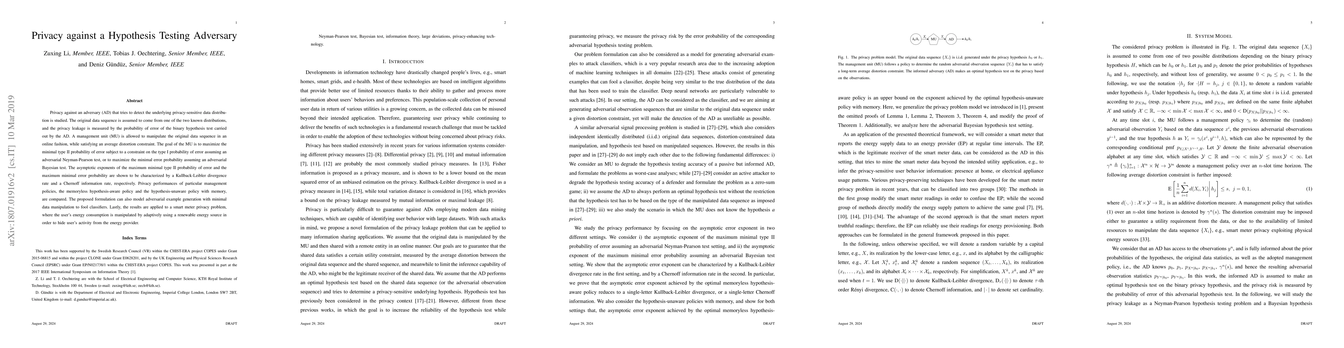 This paper studies privacy strategies against an adversary attempting to detect underlying data distributions, focusing on minimizing error probabilities in hypothesis tests. It proposes management policies to manipulate data sequences while satisfying distortion constraints, and compares their performances, ultimately applying the results to a smart meter privacy scenario.