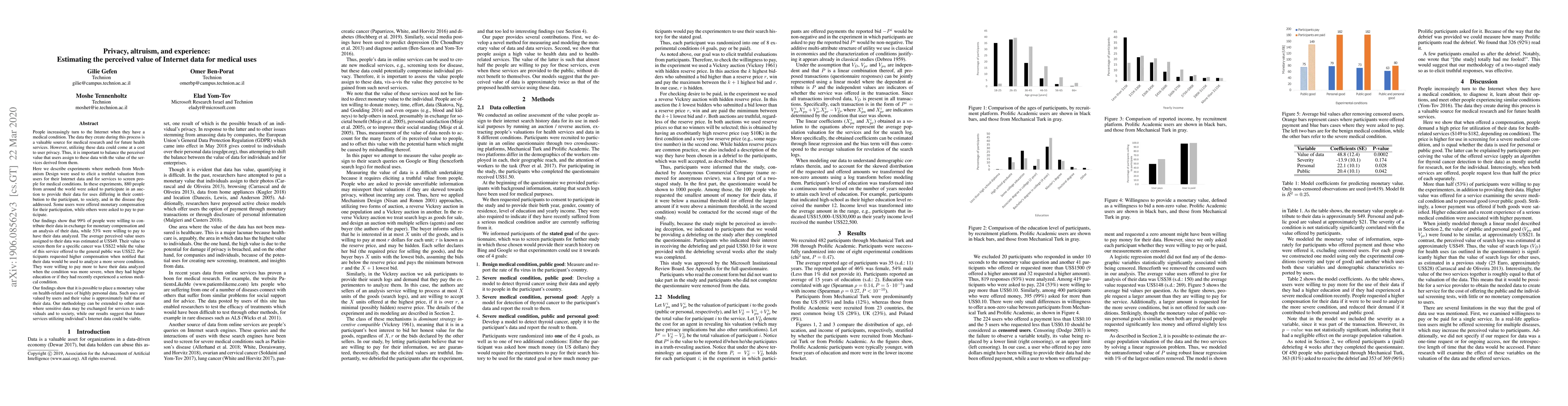 People increasingly turn to the Internet when they have a medical condition. The data they create during this process is a valuable source for medical research and for future health services. However, utilizing these data could come at a cost to user privacy. Thus, it is important to balance the perceived value that users assign to these data with the value of the services derived from them. Here we describe experiments where methods from Mechanism Design were used to elicit a truthful valuation from users for their Internet data and for services to screen people for medical conditions. In these experiments, 880 people from around the world were asked to participate in an auction to provide their data for uses differing in their contribution to the participant, to society, and in the disease they addressed. Some users were offered monetary compensation for their participation, while others were asked to pay to participate. Our findings show that 99\% of people were willing to contribute their data in exchange for monetary compensation and an analysis of their data, while 53\% were willing to pay to have their data analyzed. The average perceived value users assigned to their data was estimated at US\$49. Their value to screen them for a specific cancer was US\$22 while the value of this service offered to the general public was US\$22. Participants requested higher compensation when notified that their data would be used to analyze a more severe condition. They were willing to pay more to have their data analyzed when the condition was more severe, when they had higher education or if they had recently experienced a serious medical condition.