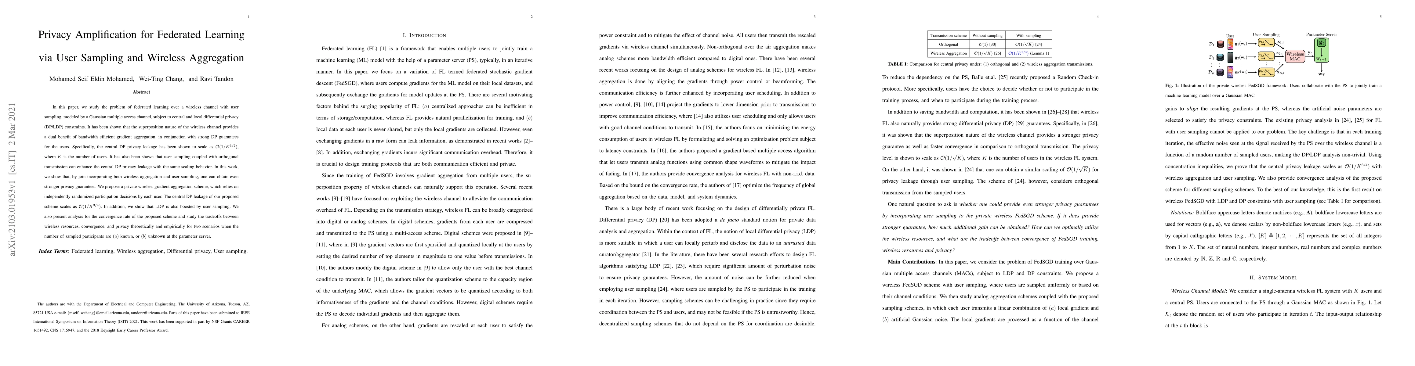 The paper studies federated learning over a wireless channel with user sampling, modeled by a Gaussian multiple access channel, under central and local differential privacy (DP/LDP) constraints. It demonstrates that wireless aggregation combined with user sampling provides stronger privacy guarantees, scaling central DP leakage to O(1/K^(3/4)) compared to O(1/K^(1/2)) without sampling.